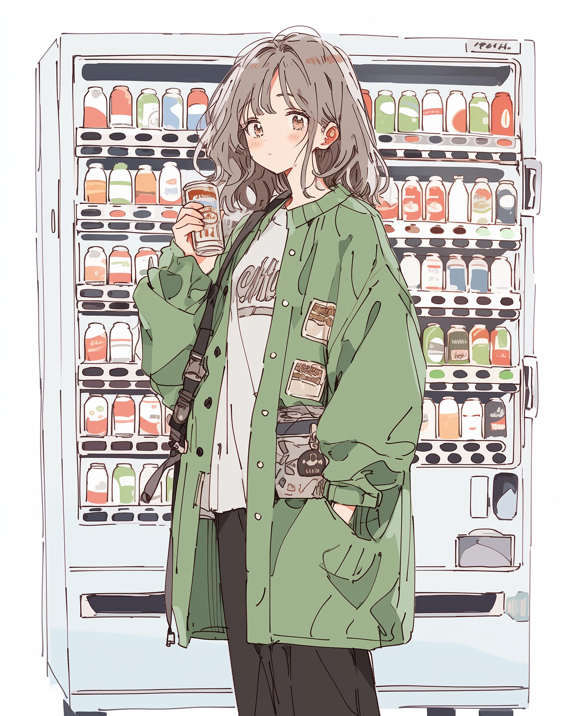 検索タグ:イラスト、ファッション、キャラクター、女性、女、女の子、女子、女の人、アニメ、漫画、マンガ、美人、美女、若い、かわいい、可愛い、カワイイ、人物、顔、美しい、綺麗、きれい、キレイ、アート、お洒落、女子高生、JK、挿絵、夏、春、パステルカラー、春服、インスタ、Instagram、自販機、自動販売機、ドリンク、飲み物、drink、緑、グリーン、Green
