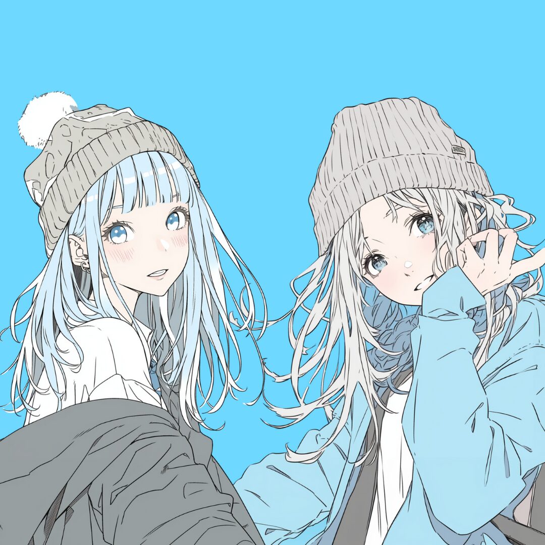 検索タグ:イラスト、ファッション、キャラクター、女性、女、女の子、女子、女の人、アニメ、漫画、マンガ、美人、美女、若い、かわいい、可愛い、カワイイ、人物、顔、美しい、綺麗、きれい、キレイ、アート、お洒落、挿絵、インスタ、Instagram、AI生成画像、fashion、コピースペース、銀髪、冬服、ニット帽、2人、仲良し
