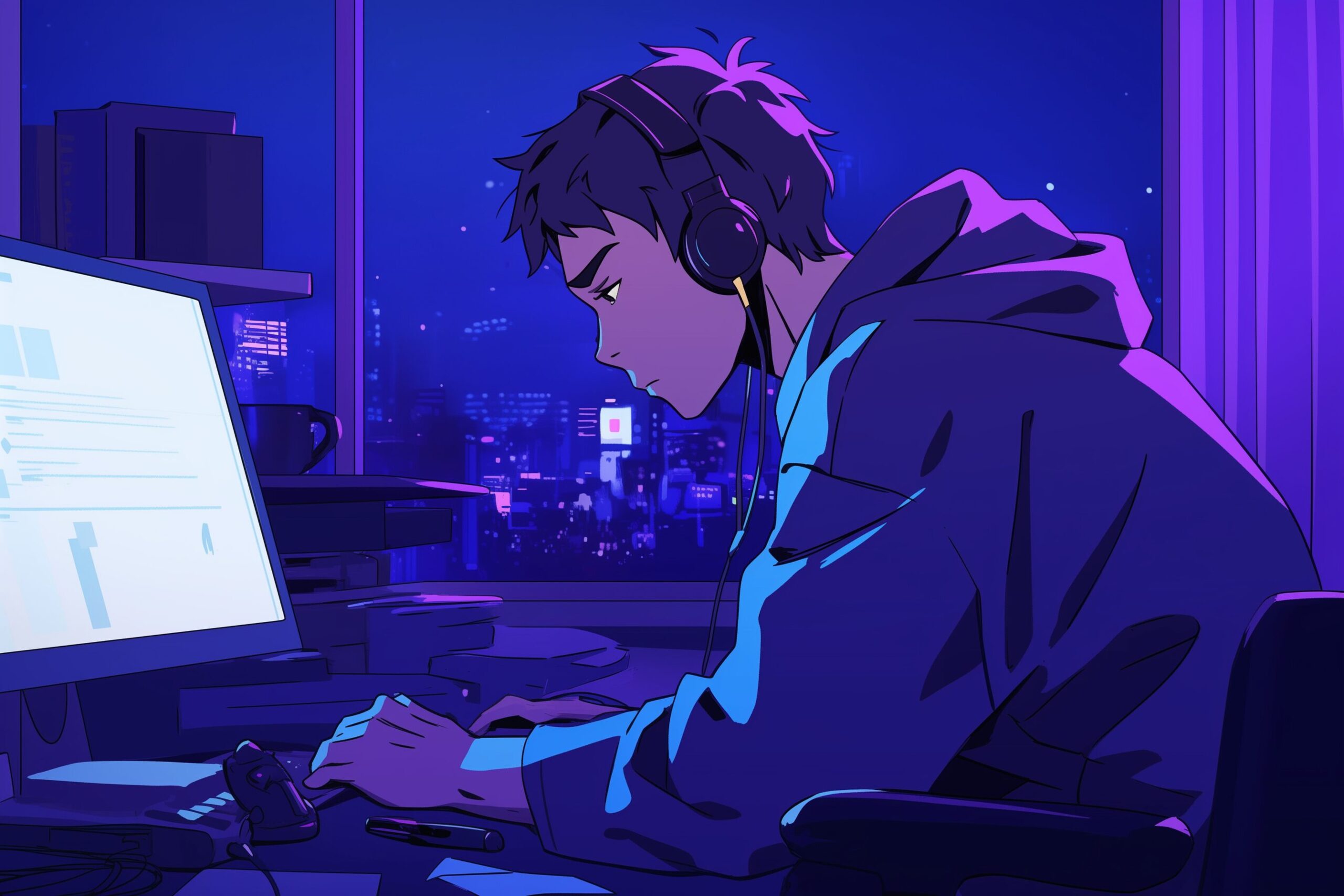 検索タグ:イラスト、キャラクター、男性、男、メンズ、男の人、アニメ、漫画、マンガ、人物、AI生成画像、コピースペース、ビジネスマン、フリーランス、在宅ワーク、パソコン、PC、仕事、働く、タイピング、横顔