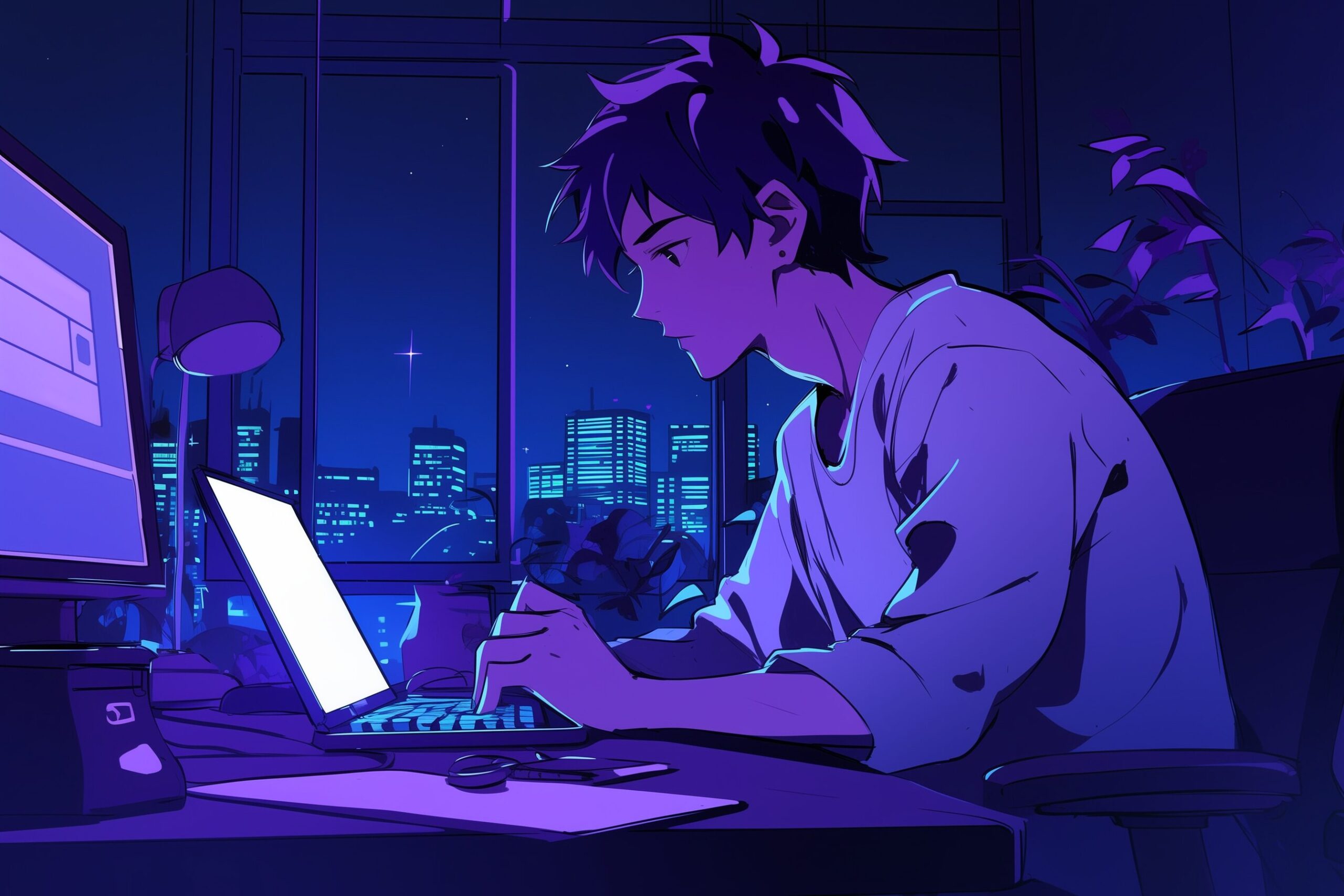 検索タグ:イラスト、キャラクター、男性、男、メンズ、男の人、アニメ、漫画、マンガ、人物、AI生成画像、コピースペース、ビジネスマン、フリーランス、在宅ワーク、パソコン、PC、仕事、働く、タイピング、横顔