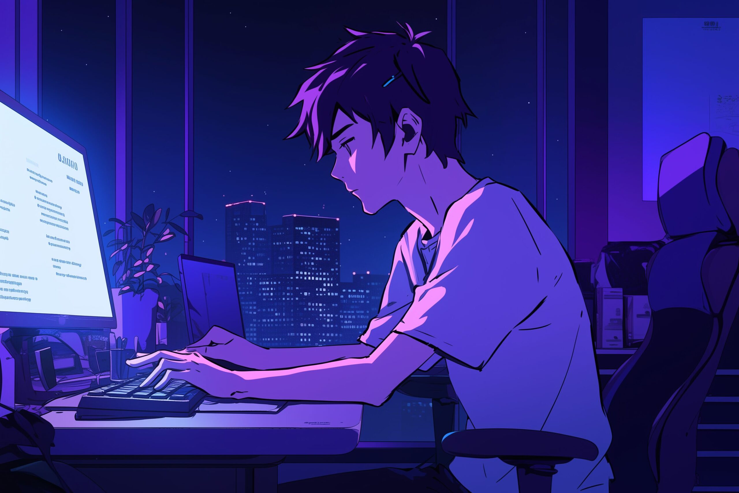 検索タグ:イラスト、キャラクター、男性、男、メンズ、男の人、アニメ、漫画、マンガ、人物、AI生成画像、コピースペース、ビジネスマン、フリーランス、在宅ワーク、パソコン、PC、仕事、働く、タイピング、横顔