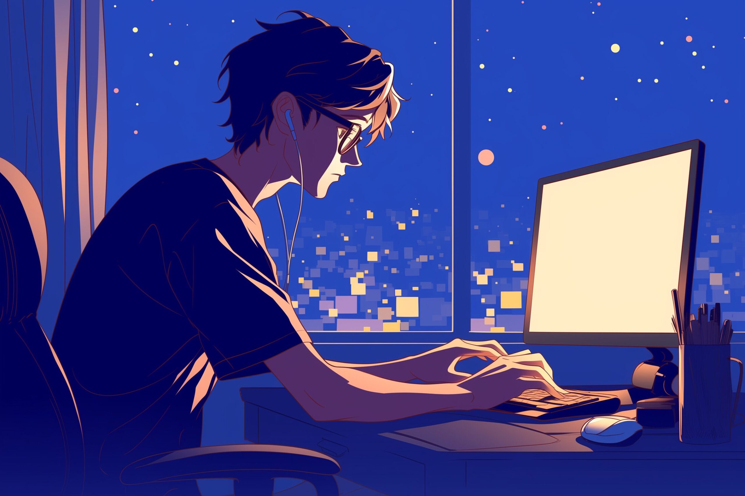 検索タグ:イラスト、キャラクター、男性、男、メンズ、男の人、アニメ、漫画、マンガ、人物、AI生成画像、コピースペース、ビジネスマン、フリーランス、在宅ワーク、パソコン、PC、仕事、働く、タイピング、横顔