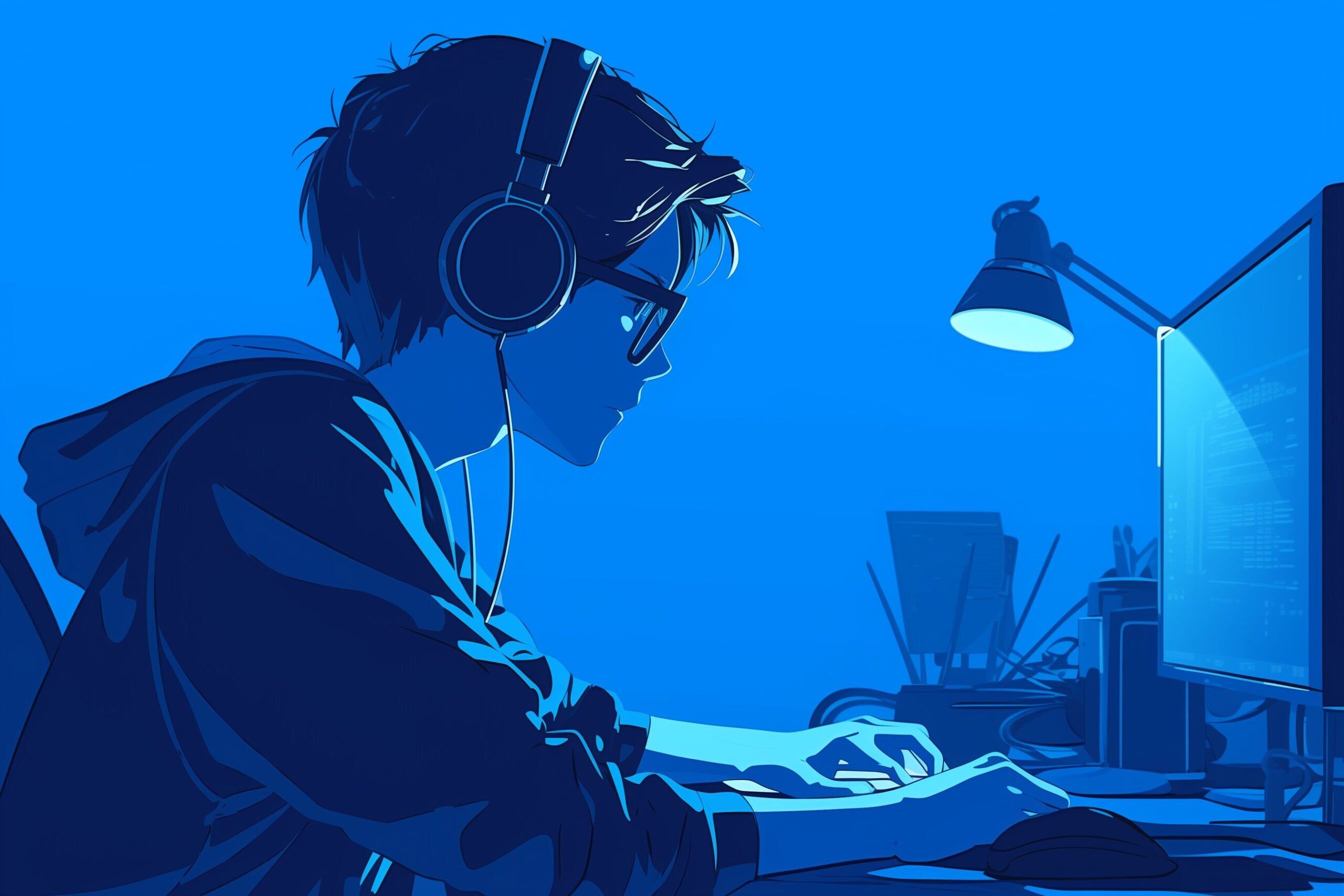 検索タグ:イラスト、キャラクター、男性、男、メンズ、男の人、アニメ、漫画、マンガ、人物、AI生成画像、コピースペース、ビジネスマン、フリーランス、在宅ワーク、パソコン、PC、仕事、働く、タイピング、横顔