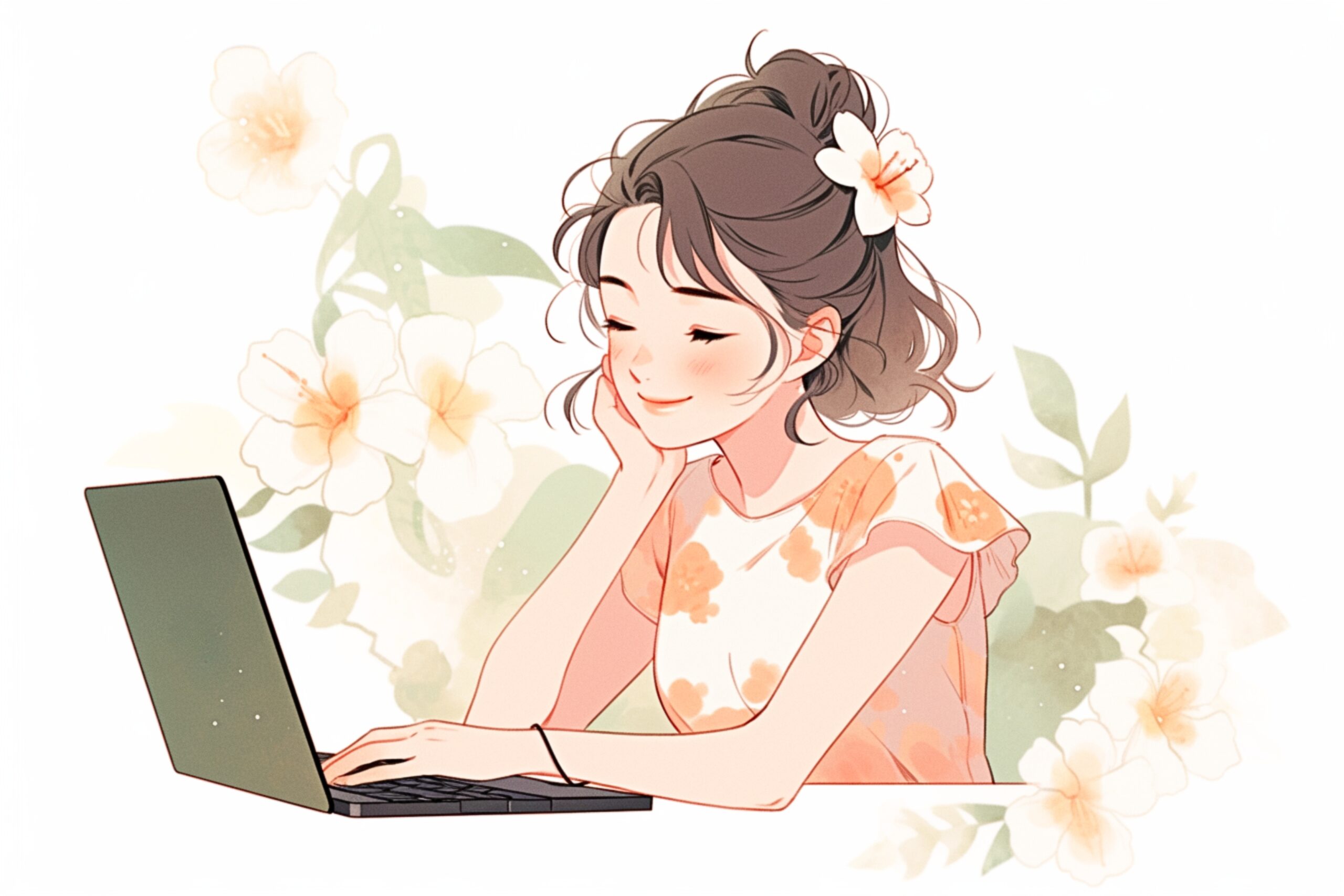 検索タグ:女性・女・女の人・女子・ビジネスウーマン・キャリアウーマン・フリーランス・個人事業主・パソコン・仕事・働く・デスクワーク・テレワーク・リモートワーク・PC・働く女性・自宅・家・後ろ姿・フリー素材・白・ノートパソコン、ノートPC、作業、タイピング、業務、パソコン作業、パソコン業務、事務作業、フリー画像、フリーランサー、オフィス、オフィスワーク、イラスト