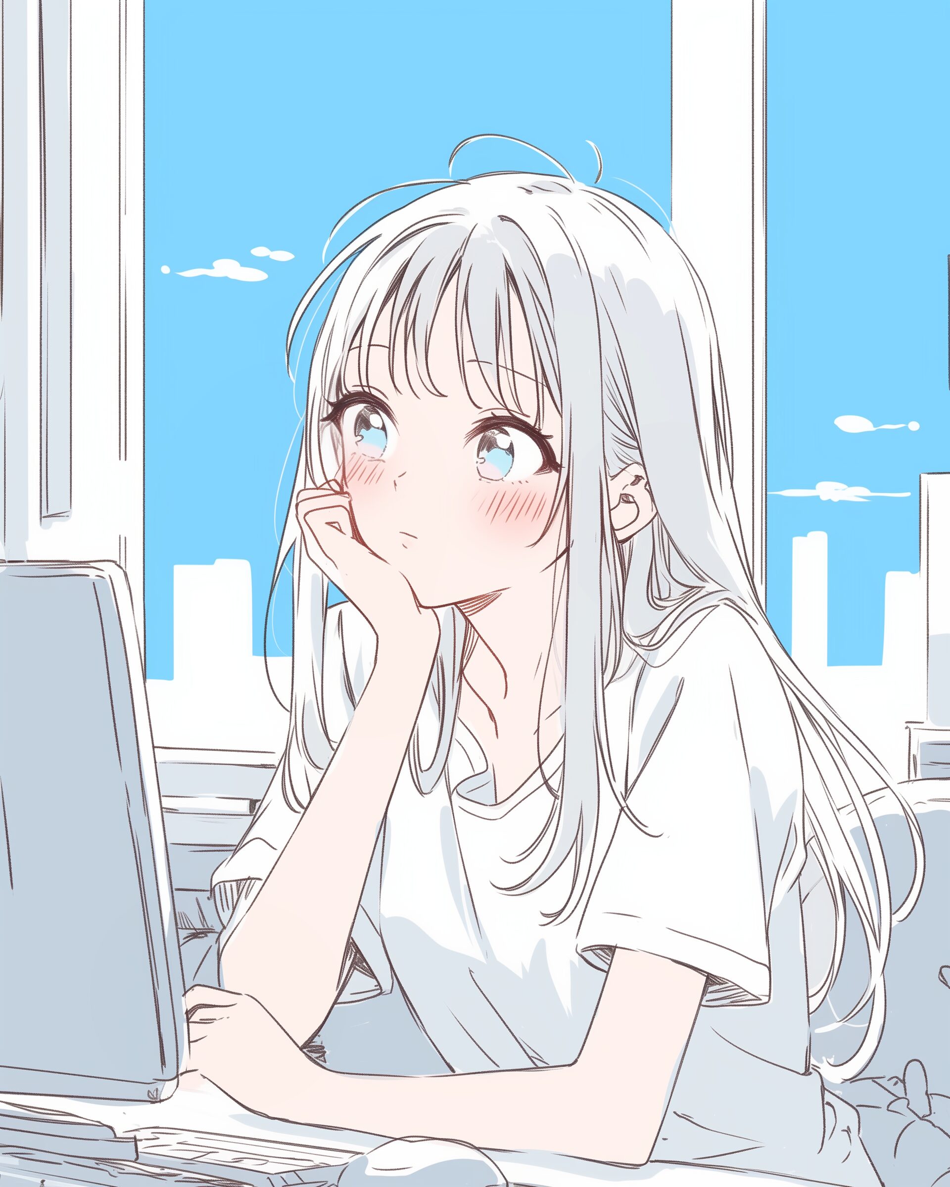 検索タグ:イラスト、ファッション、キャラクター、女性、女、女の子、女子、女の人、アニメ、漫画、マンガ、美人、美女、若い、かわいい、可愛い、カワイイ、人物、顔、美しい、綺麗、きれい、キレイ、アート、お洒落、挿絵、インスタ、Instagram、AI生成画像、fashion、コピースペース、銀髪、パソコン、仕事、YouTube、ユーチューブ、視聴、PC