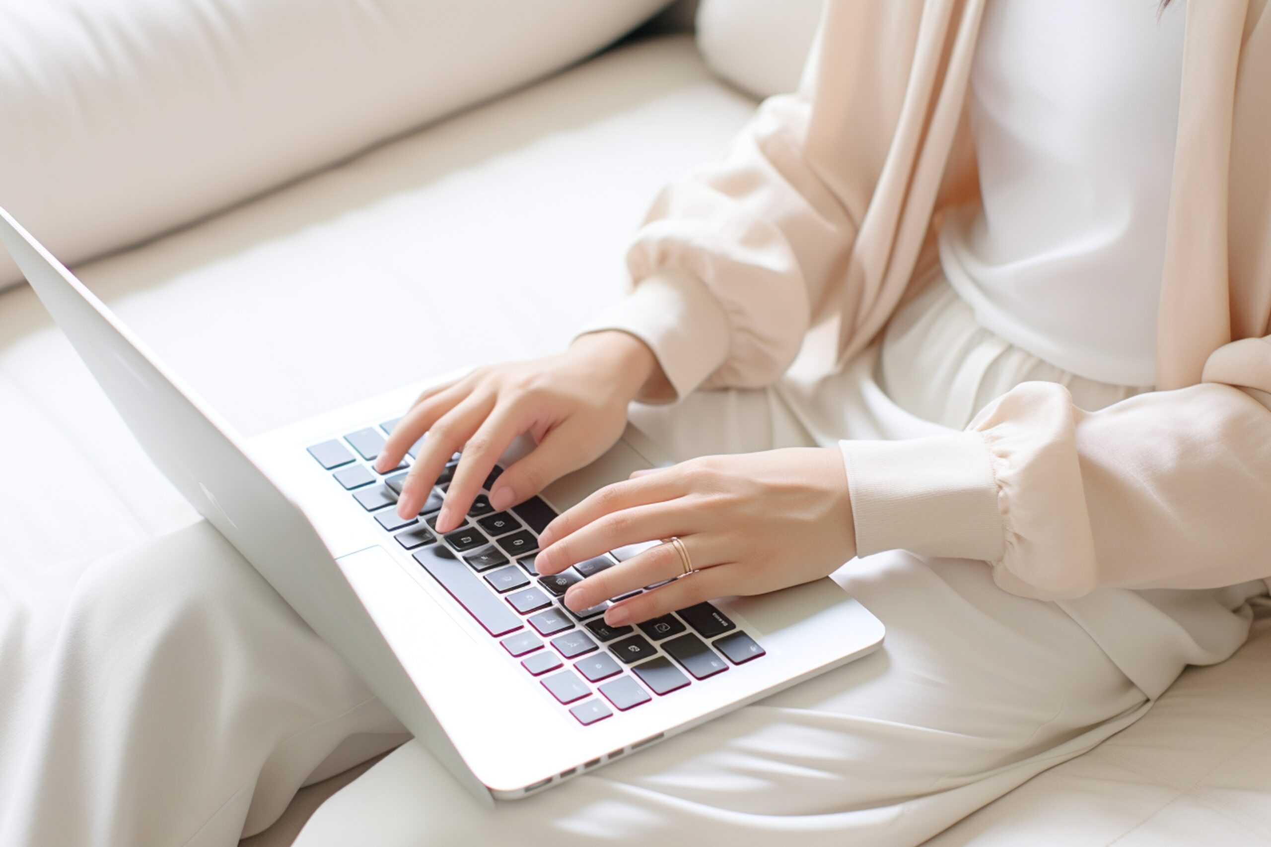 検索タグ:女性・女・女の人・女子・ビジネスウーマン・キャリアウーマン・フリーランス・個人事業主・パソコン・仕事・働く・デスクワーク・テレワーク・リモートワーク・PC・働く女性・自宅・家・後ろ姿・フリー素材・白・ノートパソコン、ノートPC、作業、タイピング、業務、パソコン作業、パソコン業務、事務作業、フリー画像、フリーランサー