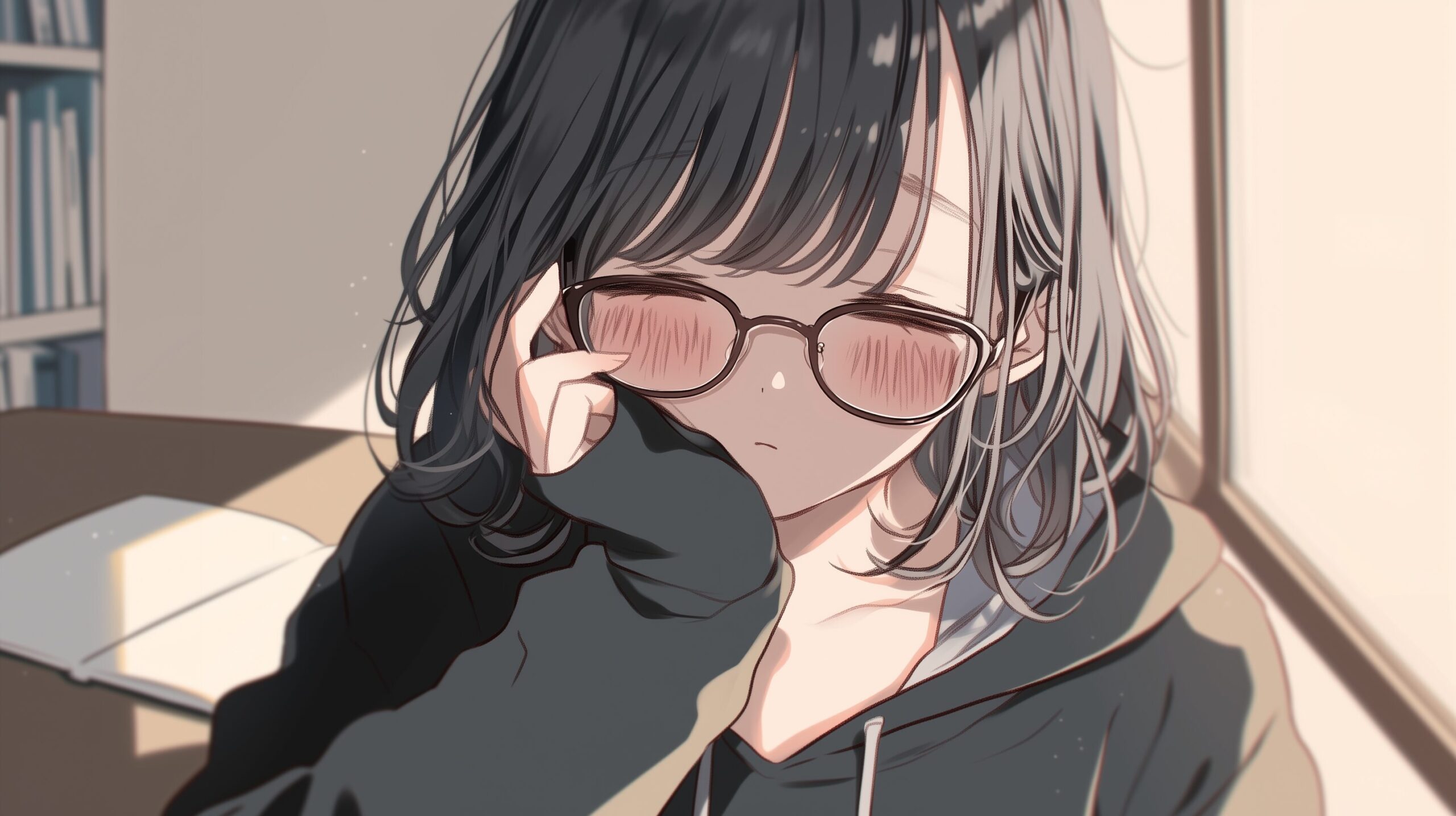 検索タグ:イラスト、キャラクター、女子、女の子、女性、女、女の人、アニメ、漫画、マンガ、若い、人物、顔、美しい、綺麗、きれい、キレイ、アート、お洒落、挿絵、インスタ、Instagram、AI生成画像、コピースペース、かわいい、可愛い、カワイイ、黒髪、橘、たちばな、ゆず、柚、キャラクター、ショートヘア、黒髪、メガネ、眼鏡、めがね、前髪ぱっつん、パッツン、横顔、パーカー、パーカー女子、勉強、学習、眠る、睡眠、寝不足、寝る、寝落ち