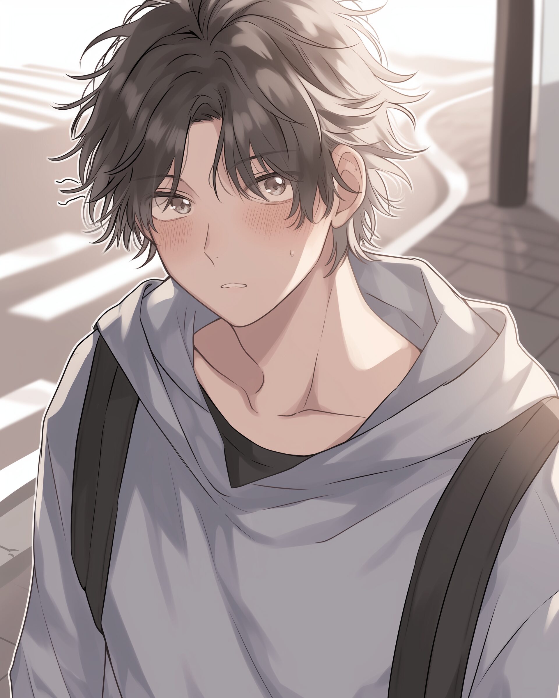 検索タグ:イラスト、ファッション、キャラクター、男性、男、男子、男の子、男の人、アニメ、漫画、マンガ、若い、人物、顔、アート、挿絵、インスタ、Instagram、AI生成画像、fashion、コピースペース、学生、高校生、大学生、リュックサック、照れる、恥ずかしい、もどかしい、黒髪、パーカー