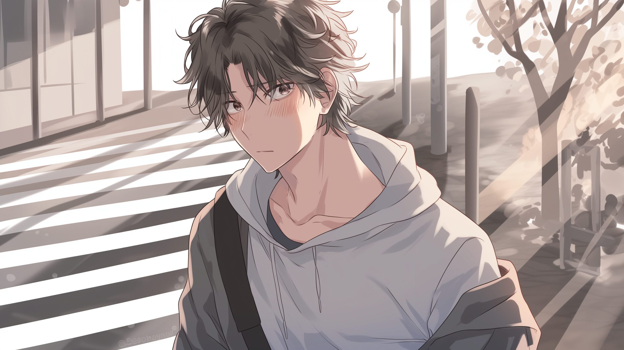 検索タグ:イラスト、ファッション、キャラクター、男性、男、男子、男の子、男の人、アニメ、漫画、マンガ、若い、人物、顔、アート、挿絵、インスタ、Instagram、AI生成画像、fashion、コピースペース、学生、高校生、大学生、リュックサック、照れる、恥ずかしい、もどかしい、黒髪、パーカー