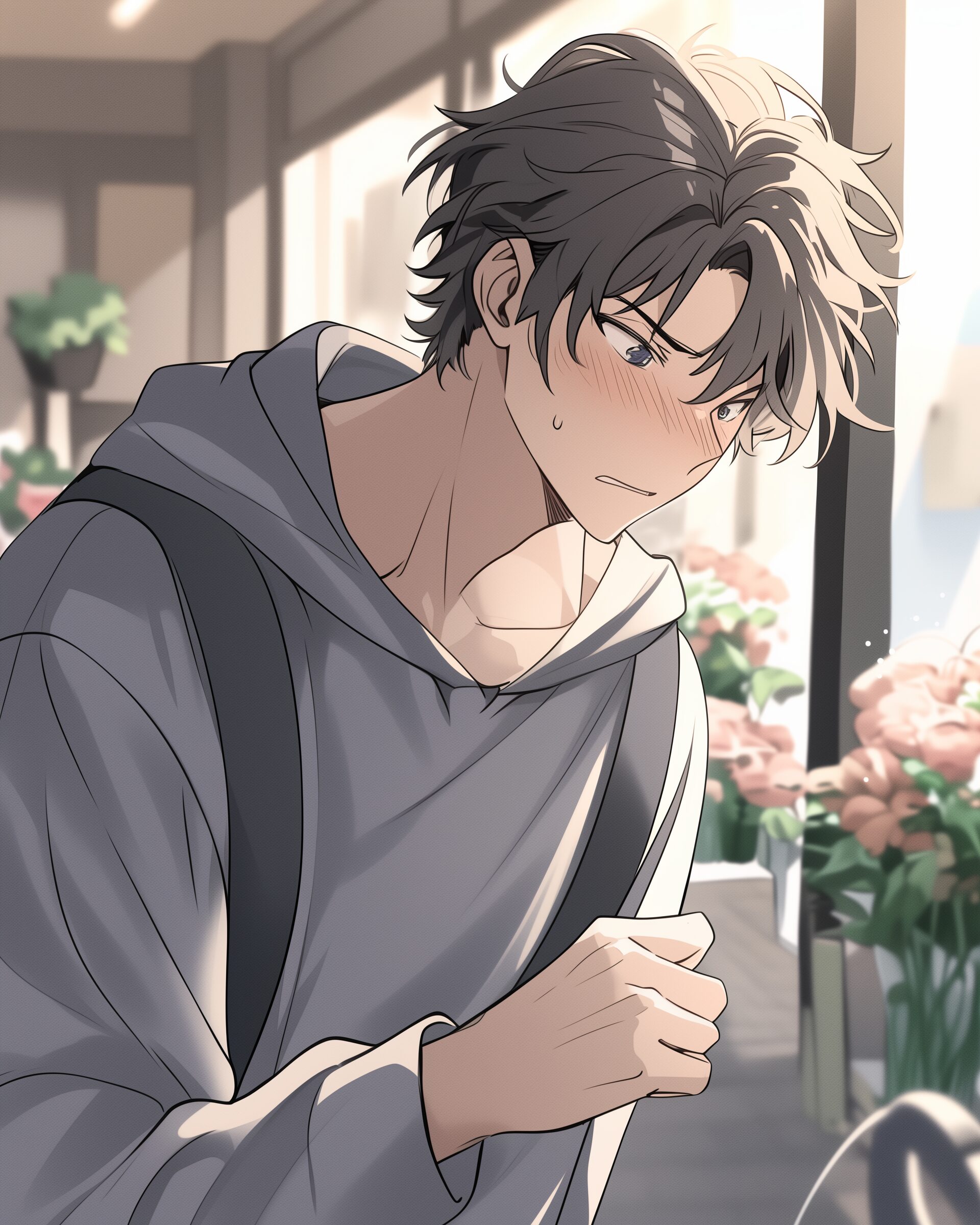 検索タグ:イラスト、ファッション、キャラクター、男性、男、男子、男の子、男の人、アニメ、漫画、マンガ、若い、人物、顔、アート、挿絵、インスタ、Instagram、AI生成画像、fashion、コピースペース、学生、高校生、大学生、リュックサック、照れる、恥ずかしい、もどかしい、黒髪、パーカー
