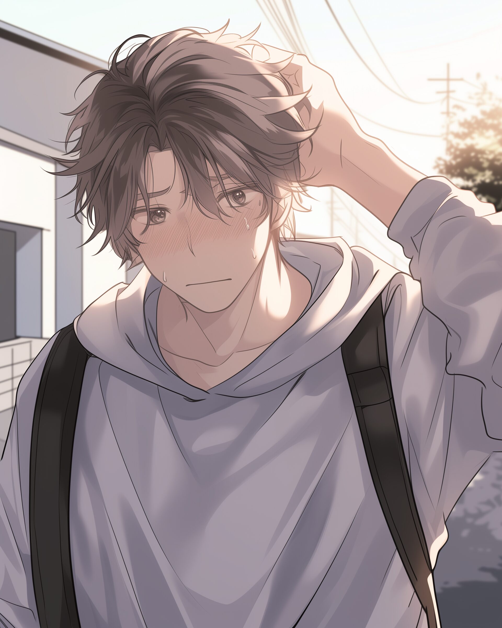 検索タグ:イラスト、ファッション、キャラクター、男性、男、男子、男の子、男の人、アニメ、漫画、マンガ、若い、人物、顔、アート、挿絵、インスタ、Instagram、AI生成画像、fashion、コピースペース、学生、高校生、大学生、リュックサック、照れる、恥ずかしい、もどかしい、黒髪、パーカー