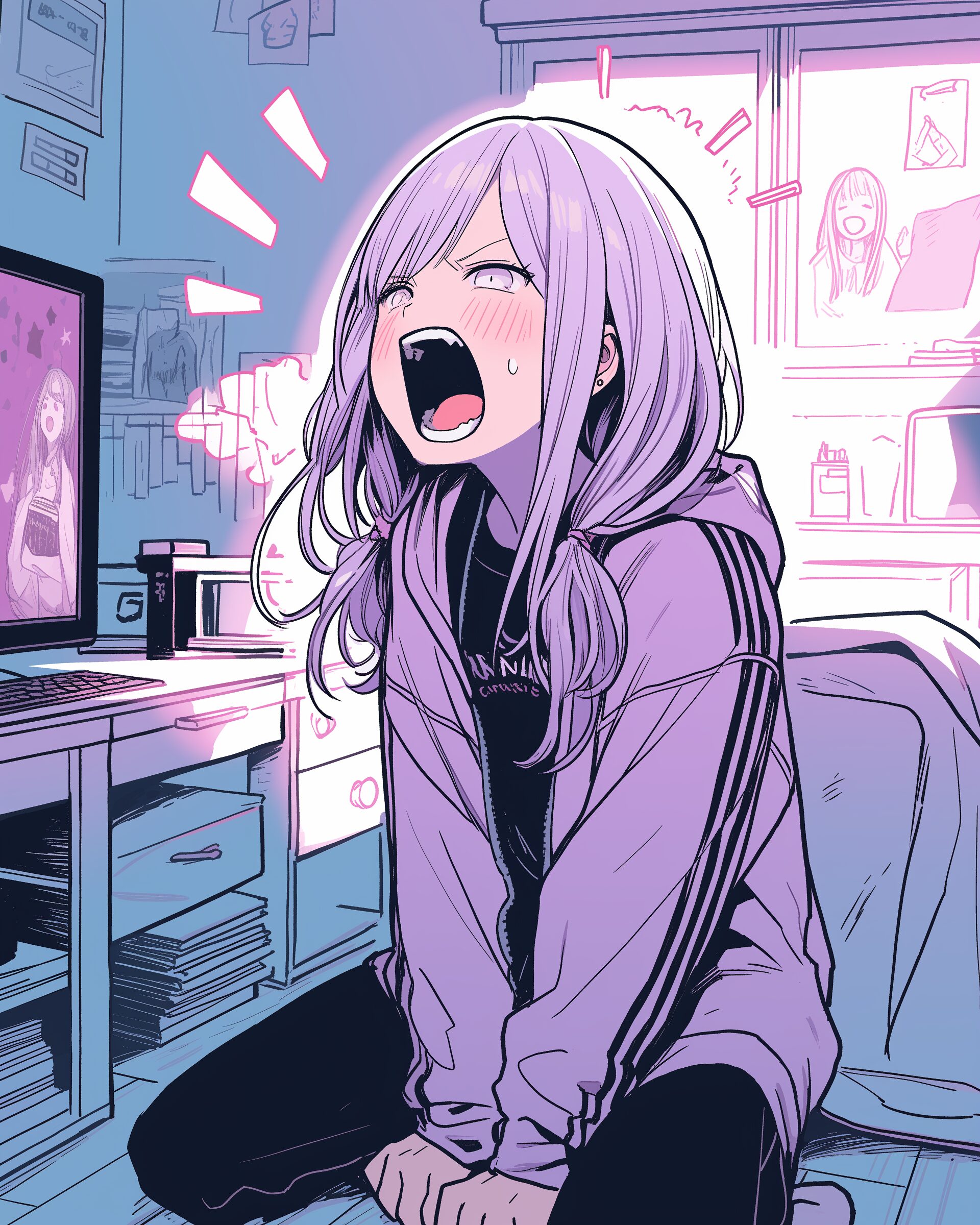 検索タグ:イラスト、ファッション、キャラクター、女性、女、女の子、女子、女の人、アニメ、漫画、マンガ、美人、美女、若い、かわいい、可愛い、カワイイ、人物、顔、美しい、綺麗、きれい、キレイ、アート、お洒落、女子高生、JK、挿絵、夏、春、パステルカラー、トップス、春服、インスタ、Instagram、紫、パープル、purple、感情、emotion、emotional、叫ぶ、パーカー女子、パーカー