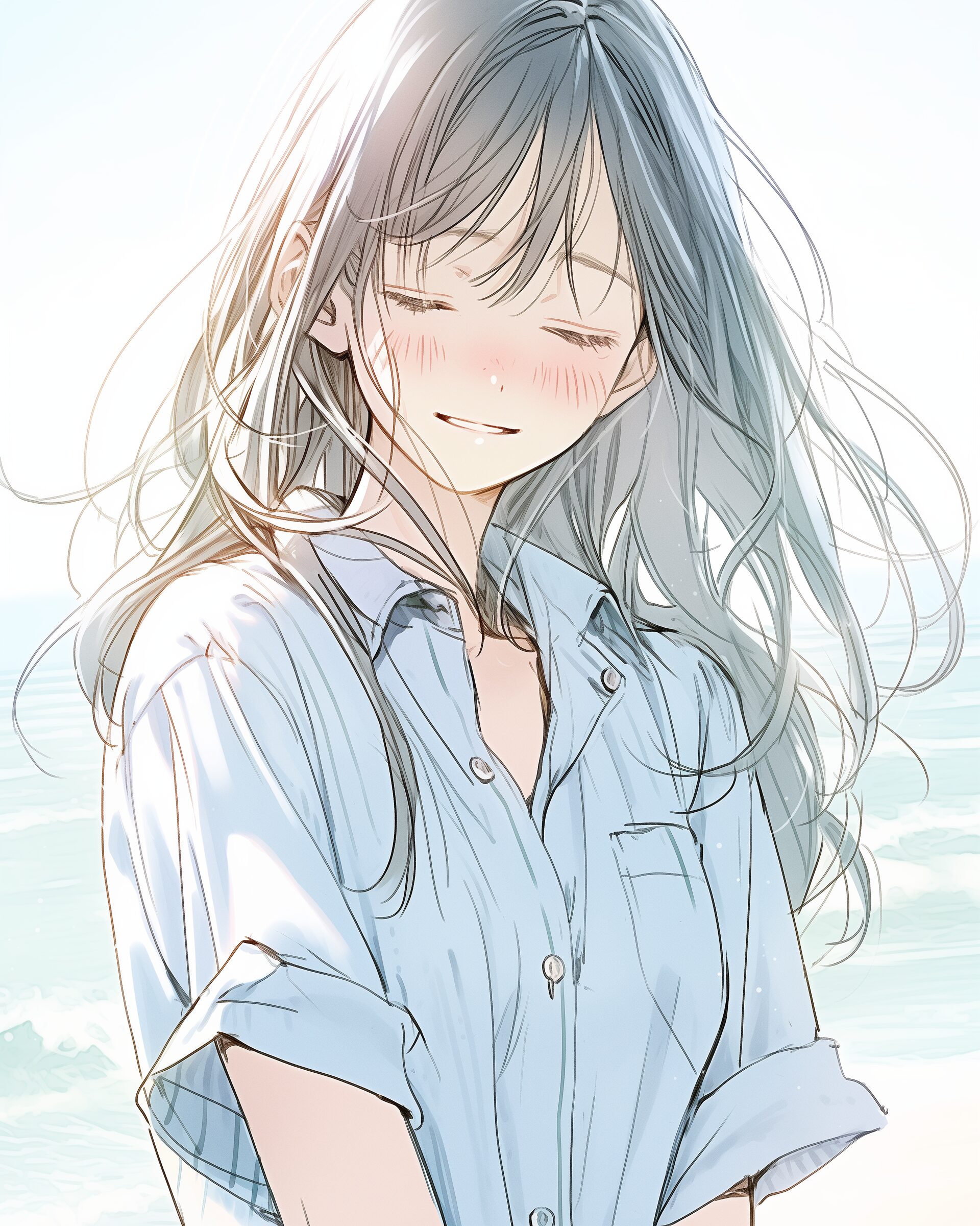 検索タグ:イラスト、ファッション、キャラクター、女性、女、女の子、女子、女の人、アニメ、漫画、マンガ、美人、美女、若い、かわいい、可愛い、カワイイ、人物、顔、美しい、綺麗、きれい、キレイ、アート、お洒落、女子高生、JK、挿絵、青、ブルー、ビーチ、夏、春、海、砂浜、シャツ、トップス、春服