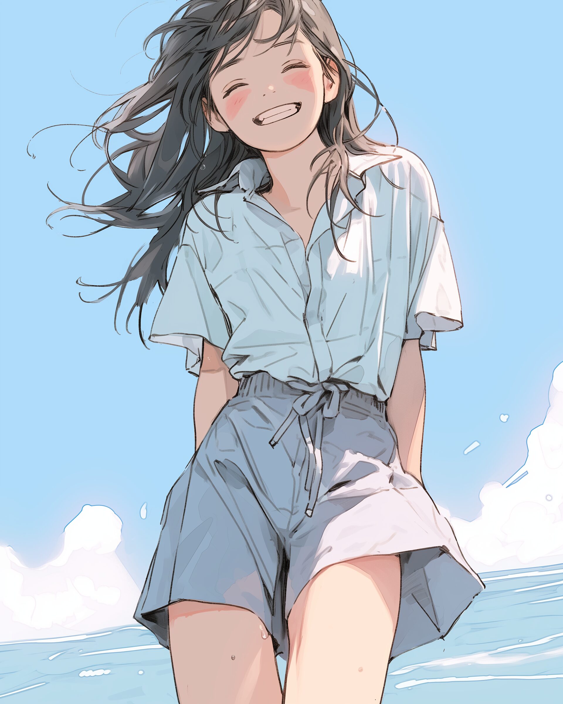 検索タグ:イラスト、ファッション、キャラクター、女性、女、女の子、女子、女の人、アニメ、漫画、マンガ、美人、美女、若い、かわいい、可愛い、カワイイ、人物、顔、美しい、綺麗、きれい、キレイ、アート、お洒落、女子高生、JK、挿絵、青、ブルー、ビーチ、夏、春、海、砂浜、シャツ、トップス、春服