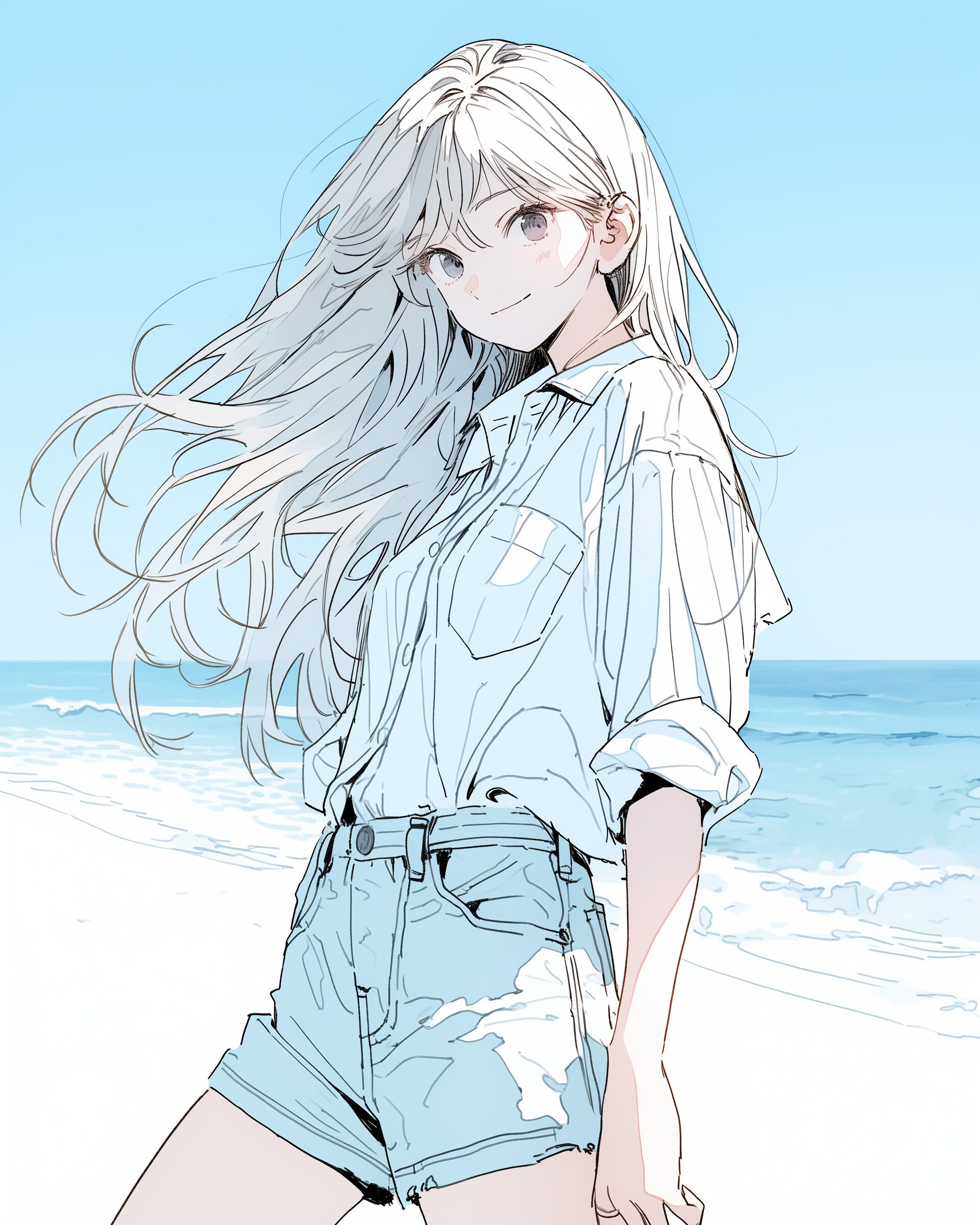 検索タグ:イラスト、ファッション、キャラクター、女性、女、女の子、女子、女の人、アニメ、漫画、マンガ、美人、美女、若い、かわいい、可愛い、カワイイ、人物、顔、美しい、綺麗、きれい、キレイ、アート、お洒落、女子高生、JK、挿絵、青、ブルー、ビーチ、夏、春、海、砂浜、シャツ、トップス、春服