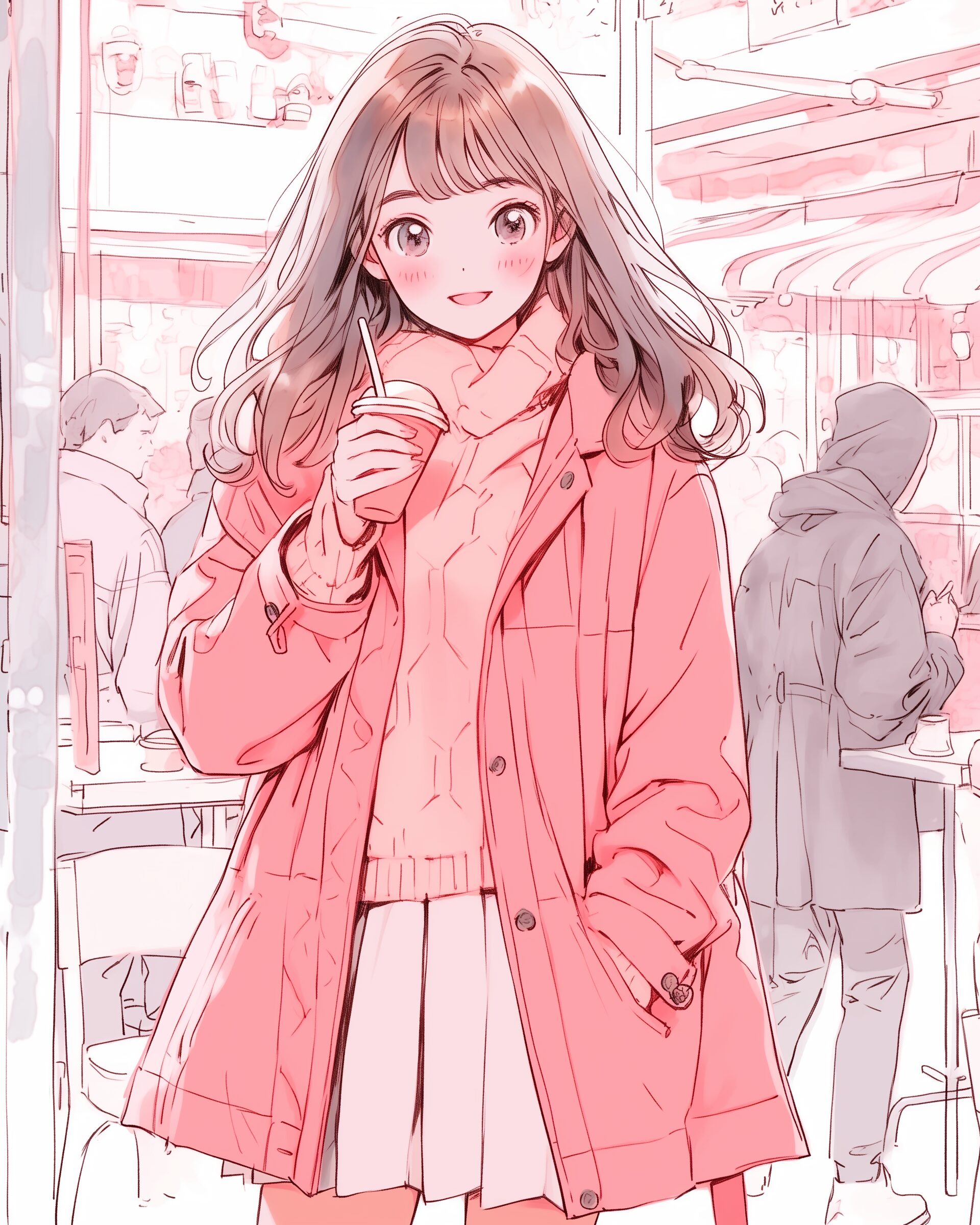 ピンクのコートを着てドリンクを持った女子イラスト01