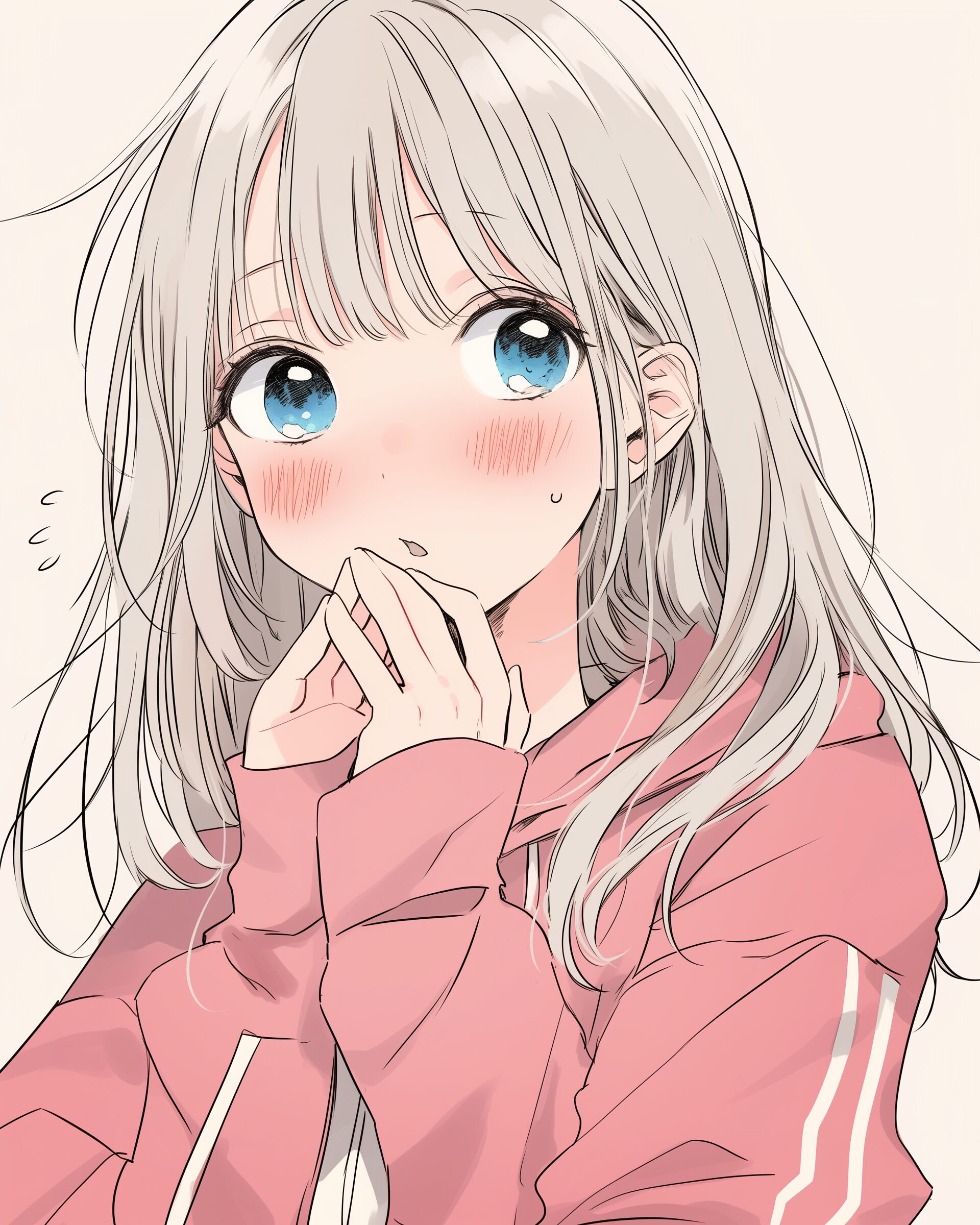 検索タグ:イラスト、ファッション、キャラクター、女性、女、女の子、女子、女の人、アニメ、漫画、マンガ、美人、美女、若い、かわいい、可愛い、カワイイ、人物、顔、美しい、綺麗、きれい、キレイ、アート、お洒落、挿絵、インスタ、Instagram、AI生成画像、fashion、コピースペース、銀髪、ピンクパーカー女子、驚き、驚く、ジャージ