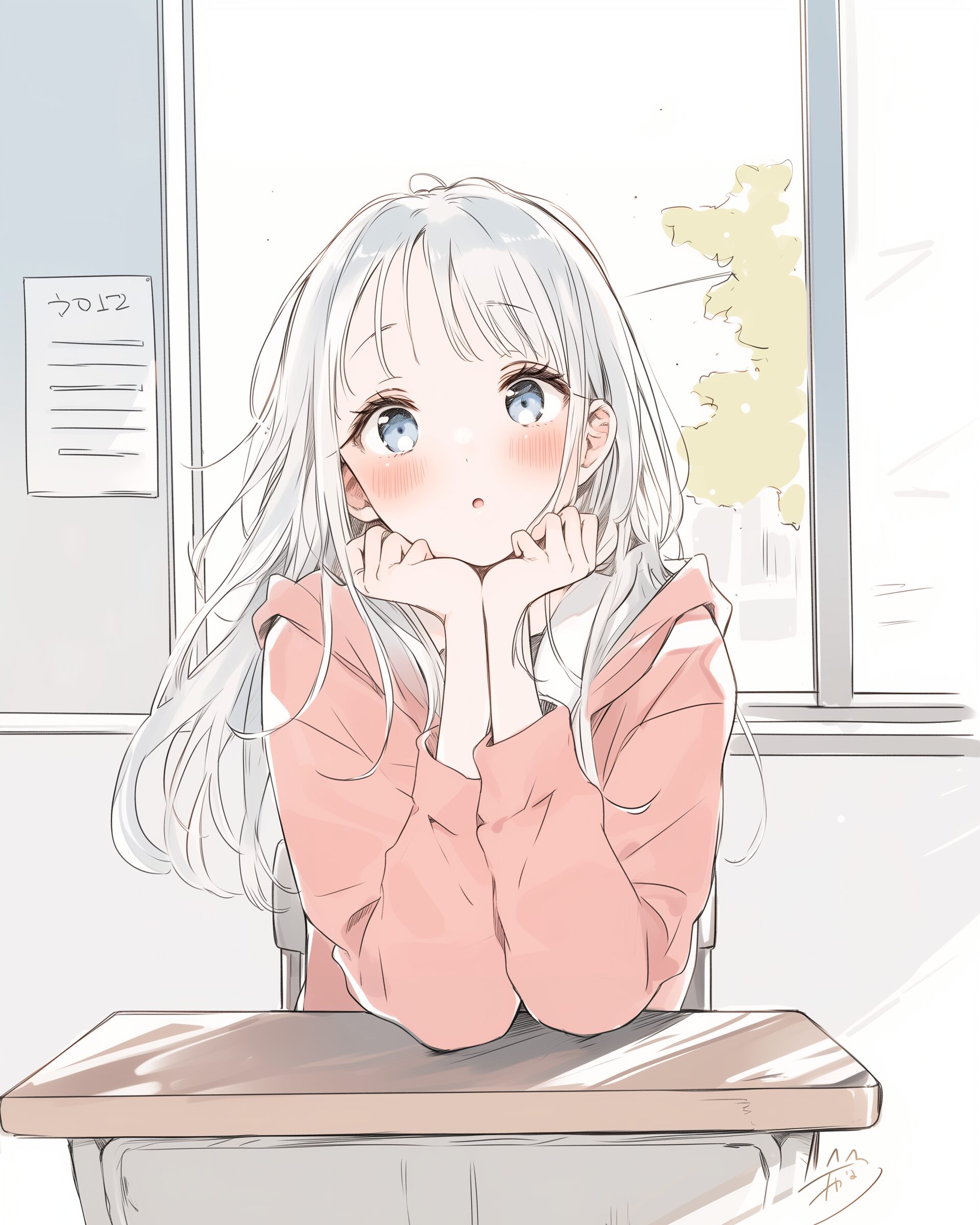 検索タグ:イラスト、ファッション、キャラクター、女性、女、女の子、女子、女の人、アニメ、漫画、マンガ、美人、美女、若い、かわいい、可愛い、カワイイ、人物、顔、美しい、綺麗、きれい、キレイ、アート、お洒落、挿絵、インスタ、Instagram、AI生成画像、fashion、コピースペース、銀髪、ピンクパーカー女子、驚き、驚く、ジャージ
