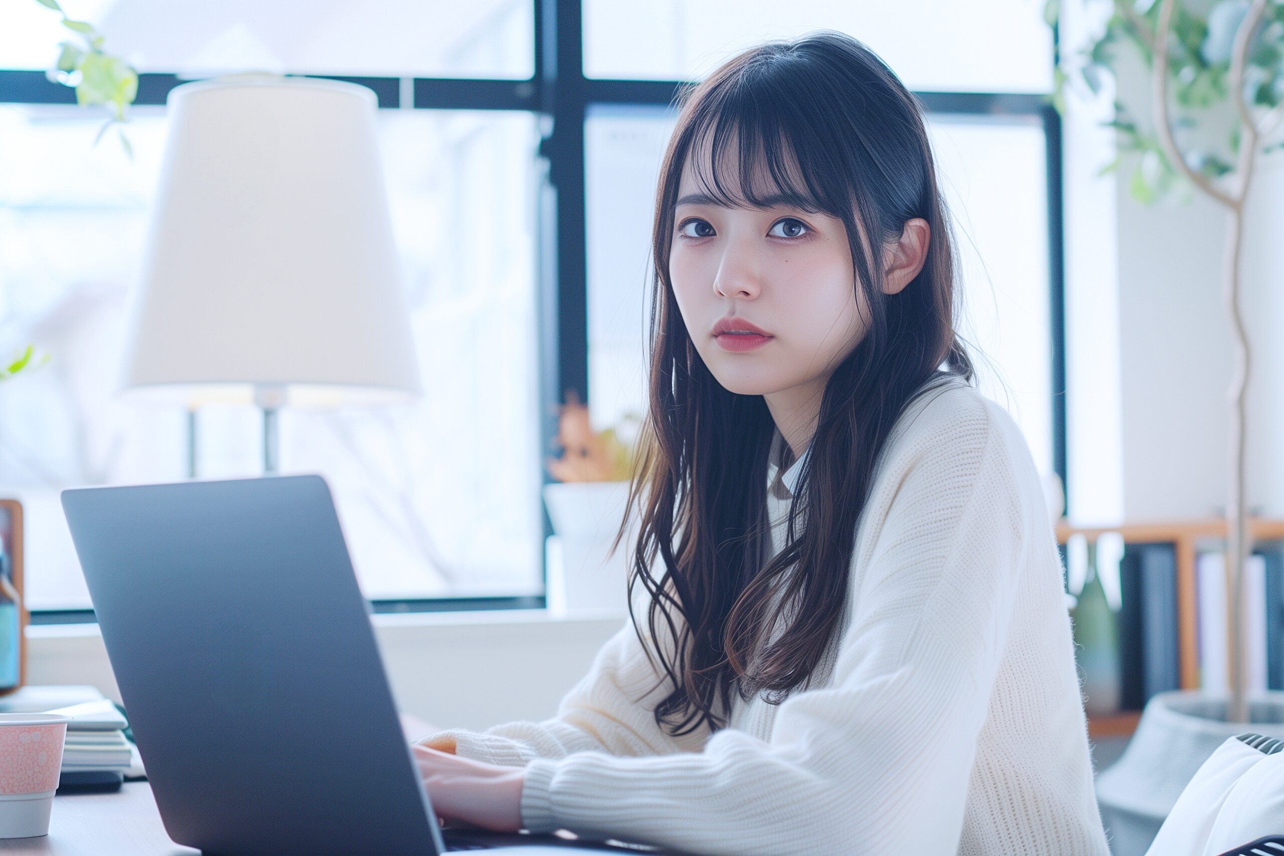 検索タグ:女性・女・女の人・女子・ビジネスウーマン・キャリアウーマン・フリーランス・個人事業主・パソコン・仕事・働く・デスクワーク・テレワーク・リモートワーク・PC・働く女性・自宅・家・後ろ姿・フリー素材・白・ノートパソコン、ノートPC、作業、タイピング、業務、パソコン作業、パソコン業務、事務作業、フリー画像、フリーランサー