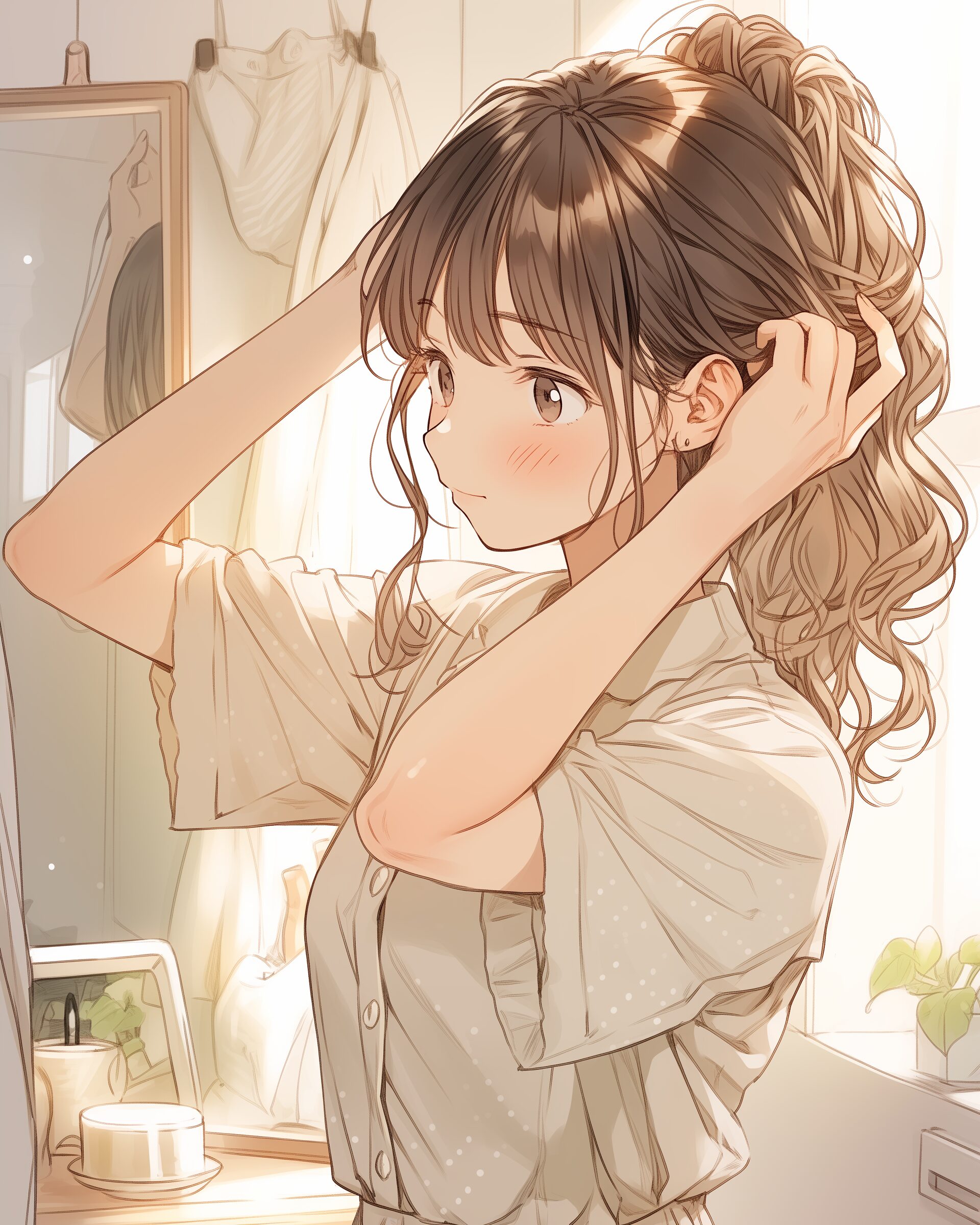 検索タグ:イラスト、ファッション、キャラクター、女性、女、女の子、女子、女の人、アニメ、漫画、マンガ、美人、美女、若い、かわいい、可愛い、カワイイ、人物、顔、美しい、綺麗、きれい、キレイ、アート、お洒落、女子高生、JK、挿絵、夏、春、パステルカラー、春服、インスタ、Instagram、夏、夏服、summer、fashion、サムネイル、アイキャッチ、コピースペース、beige、ベージュ、ヘアアレンジ、髪をセット