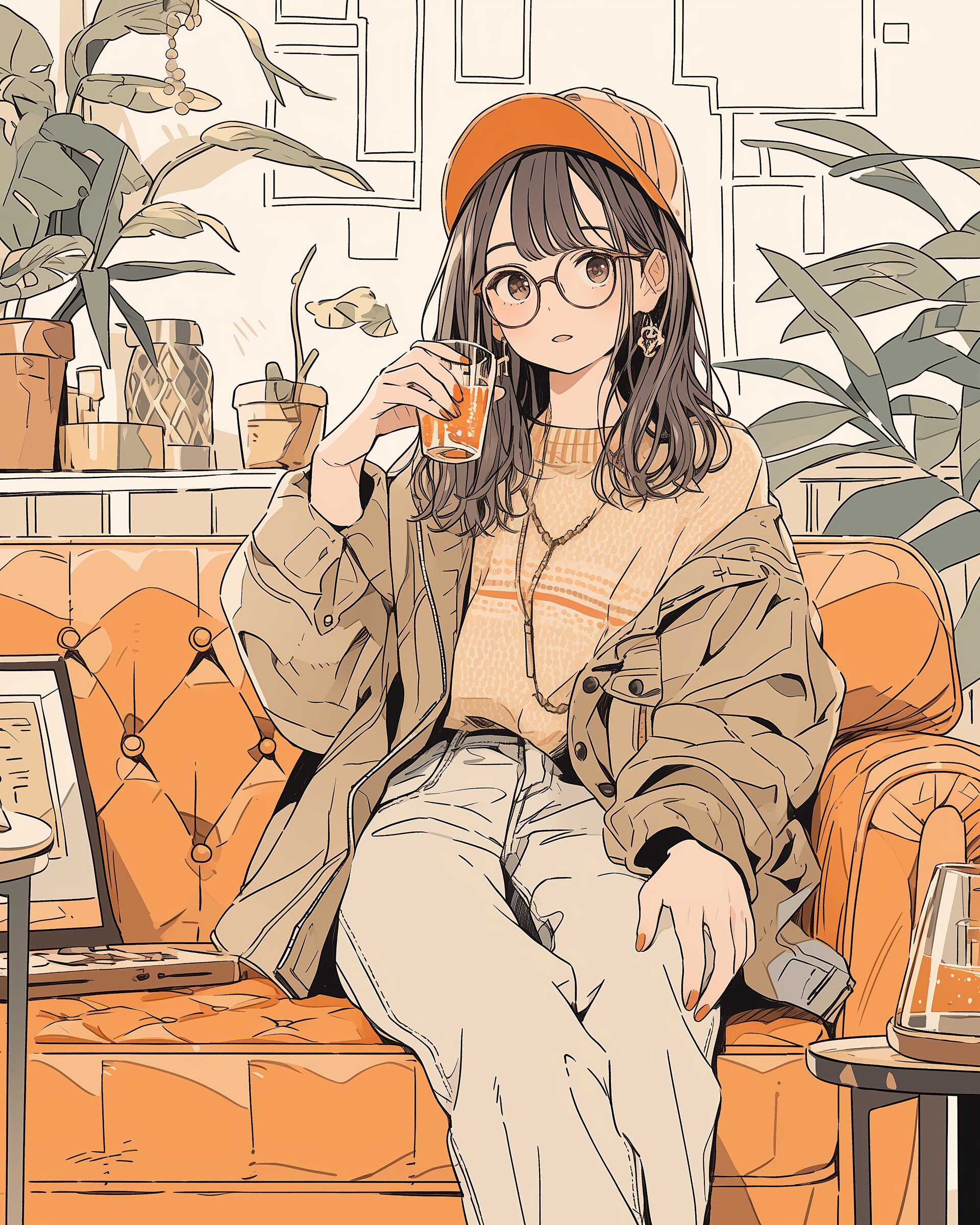 検索タグ:イラスト、ファッション、キャラクター、女性、女、女の子、女子、女の人、アニメ、漫画、マンガ、美人、美女、若い、かわいい、可愛い、カワイイ、人物、顔、美しい、綺麗、きれい、キレイ、アート、お洒落、女子高生、JK、挿絵、夏、春、パステルカラー、トップス、春服、インスタ、Instagram、ベージュ、beige、オレンジ、orange、カフェ