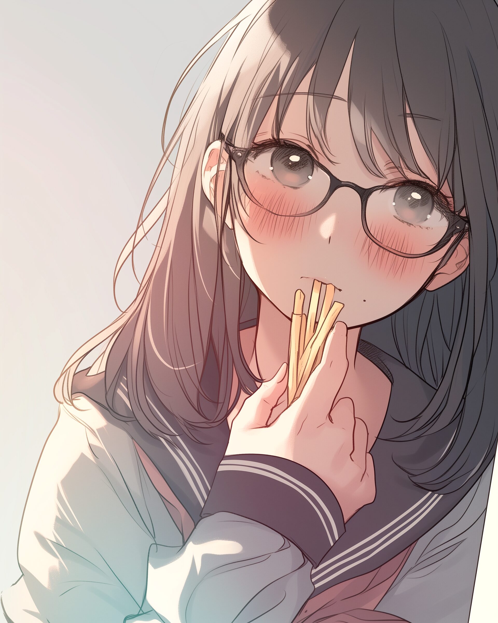 検索タグ:イラスト、ファッション、キャラクター、女性、女、女の子、女子、女の人、アニメ、漫画、マンガ、美人、美女、若い、かわいい、可愛い、カワイイ、人物、顔、美しい、綺麗、きれい、キレイ、アート、お洒落、挿絵、インスタ、Instagram、AI生成画像、fashion、コピースペース、黒髪、眼鏡、めがね、メガネ、JK、女子高生、ポテト、フライドポテト、ファーストフード、食べる、学生、橘柚、たちばな、ゆず