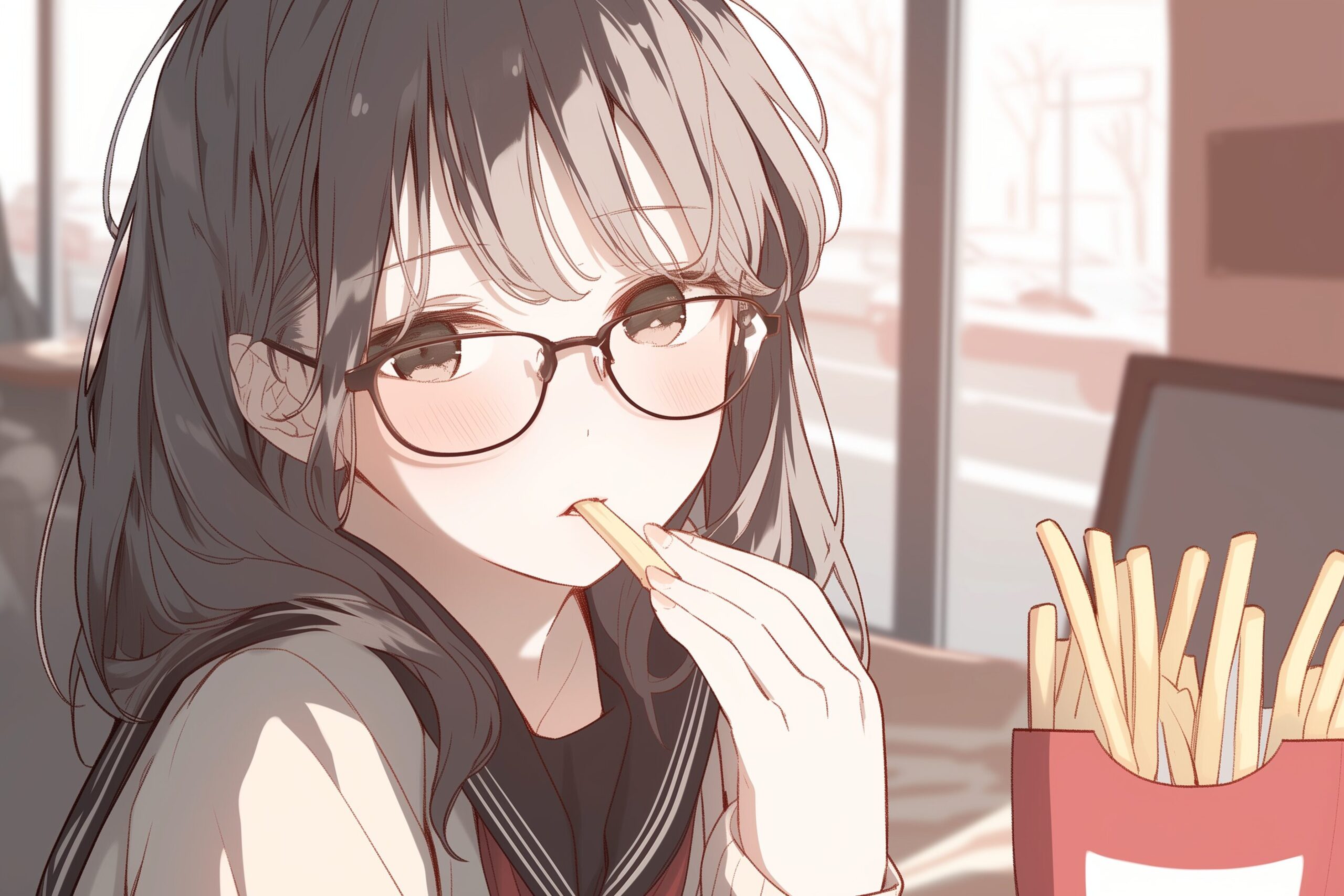 検索タグ:イラスト、ファッション、キャラクター、女性、女、女の子、女子、女の人、アニメ、漫画、マンガ、美人、美女、若い、かわいい、可愛い、カワイイ、人物、顔、美しい、綺麗、きれい、キレイ、アート、お洒落、挿絵、インスタ、Instagram、AI生成画像、fashion、コピースペース、黒髪、眼鏡、めがね、メガネ、JK、女子高生、ポテト、フライドポテト、ファーストフード、食べる、学生、橘柚、たちばな、ゆず