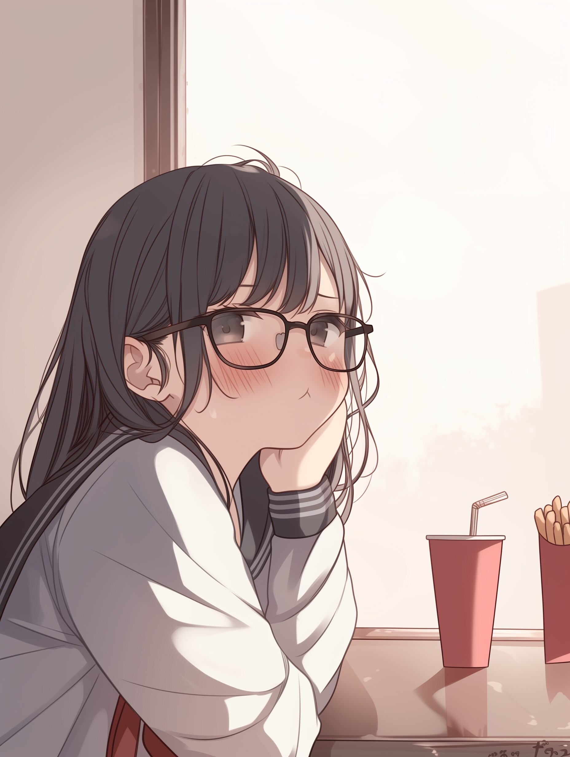 検索タグ:イラスト、ファッション、キャラクター、女性、女、女の子、女子、女の人、アニメ、漫画、マンガ、美人、美女、若い、かわいい、可愛い、カワイイ、人物、顔、美しい、綺麗、きれい、キレイ、アート、お洒落、挿絵、インスタ、Instagram、AI生成画像、fashion、コピースペース、黒髪、眼鏡、めがね、メガネ、JK、女子高生、ポテト、フライドポテト、ファーストフード、食べる、学生、橘柚、たちばな、ゆず
