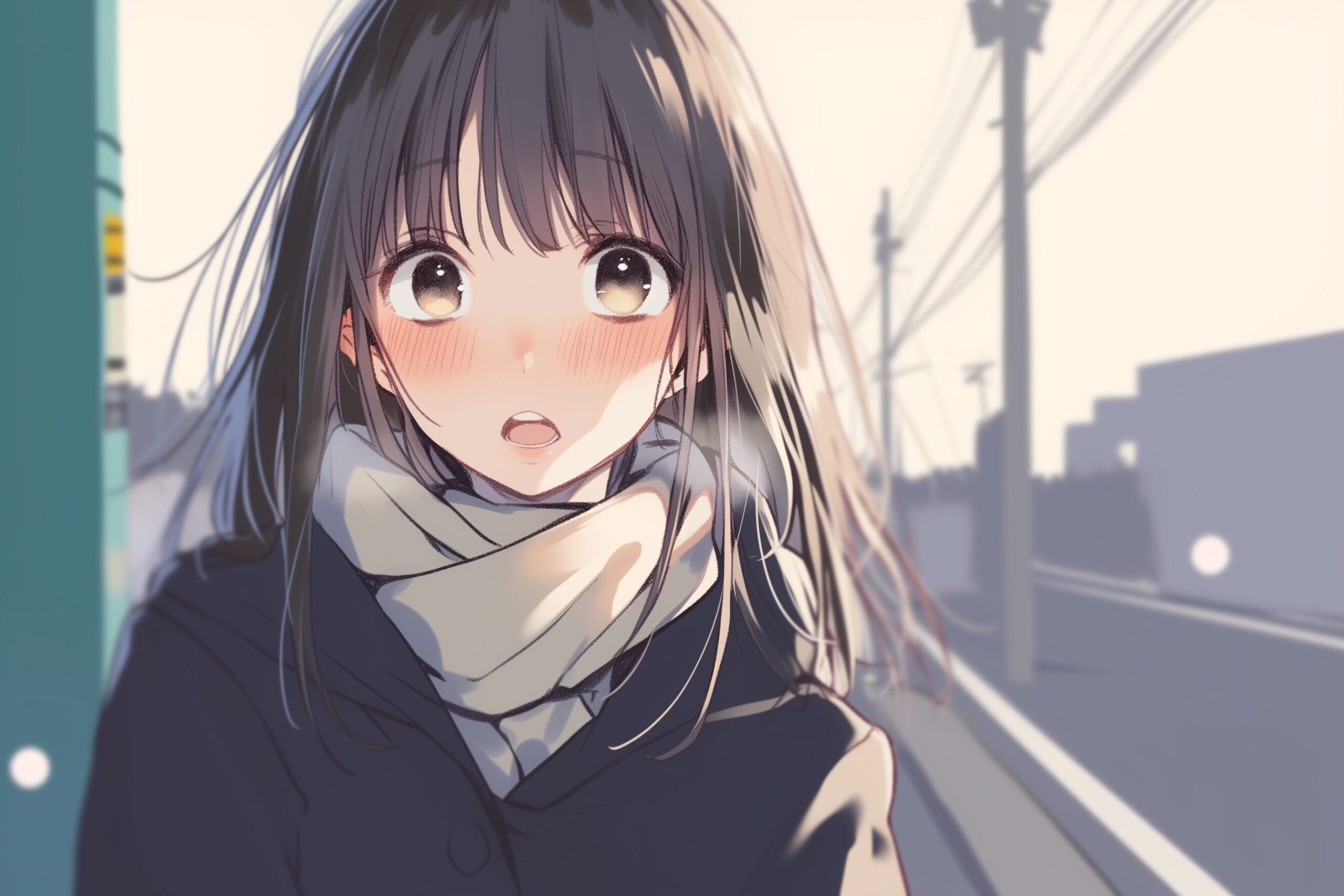 検索タグ:イラスト、キャラクター、女子、女の子、女性、女、女の人、アニメ、漫画、マンガ、若い、人物、顔、美しい、綺麗、きれい、キレイ、アート、お洒落、挿絵、インスタ、Instagram、AI生成画像、コピースペース、かわいい、可愛い、カワイイ、黒髪、コーディネート、ファッション、マフラー、ストール、コート、ファッション