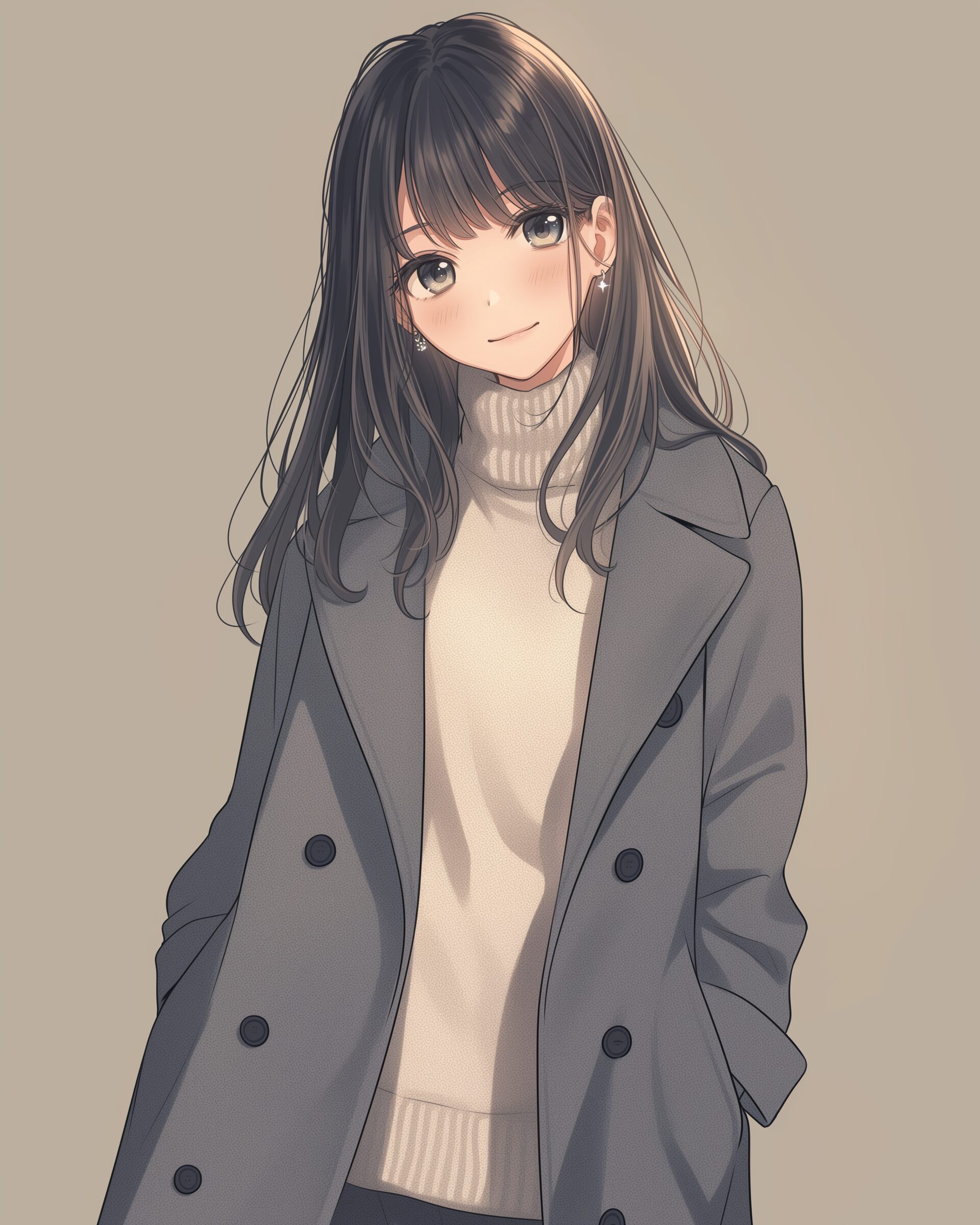 検索タグ:イラスト、キャラクター、女子、女の子、女性、女、女の人、アニメ、漫画、マンガ、若い、人物、顔、美しい、綺麗、きれい、キレイ、アート、お洒落、挿絵、インスタ、Instagram、AI生成画像、コピースペース、かわいい、可愛い、カワイイ、黒髪、コーディネート、ファッション、マフラー、ストール、コート、ファッション、夜