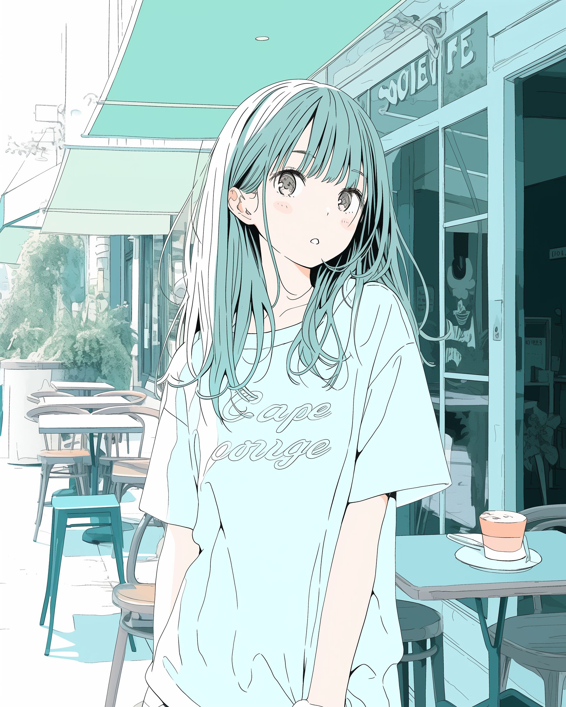 検索タグ:イラスト、ファッション、キャラクター、女性、女、女の子、女子、女の人、アニメ、漫画、マンガ、美人、美女、若い、かわいい、可愛い、カワイイ、人物、顔、美しい、綺麗、きれい、キレイ、アート、お洒落、女子高生、JK、挿絵、夏、春、パステルカラー、春服、インスタ、Instagram、爽やか、さわやか、Tシャツ、緑、グリーン、Green