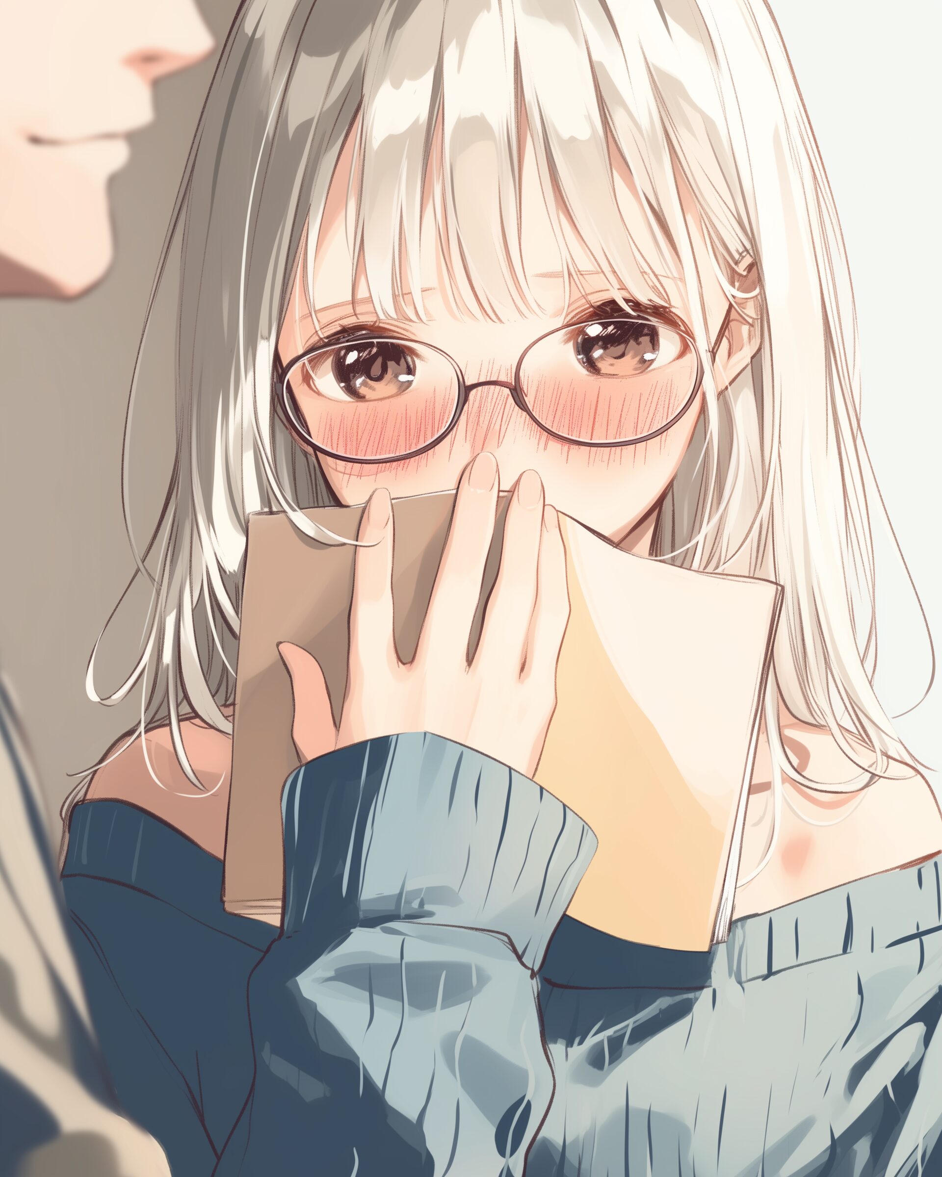 検索タグ:イラスト、キャラクター、女性、女、女の子、女子、女の人、アニメ、漫画、マンガ、美人、美女、若い、かわいい、可愛い、カワイイ、人物、顔、美しい、綺麗、きれい、キレイ、アート、お洒落、挿絵、インスタ、Instagram、AI生成画像、コピースペース、銀髪、出会い、恋、恋愛、本、図書館、メガネ、めがね、眼鏡、恥ずかしい、照れる、ドキドキ、Silent Pages、サイレントページ