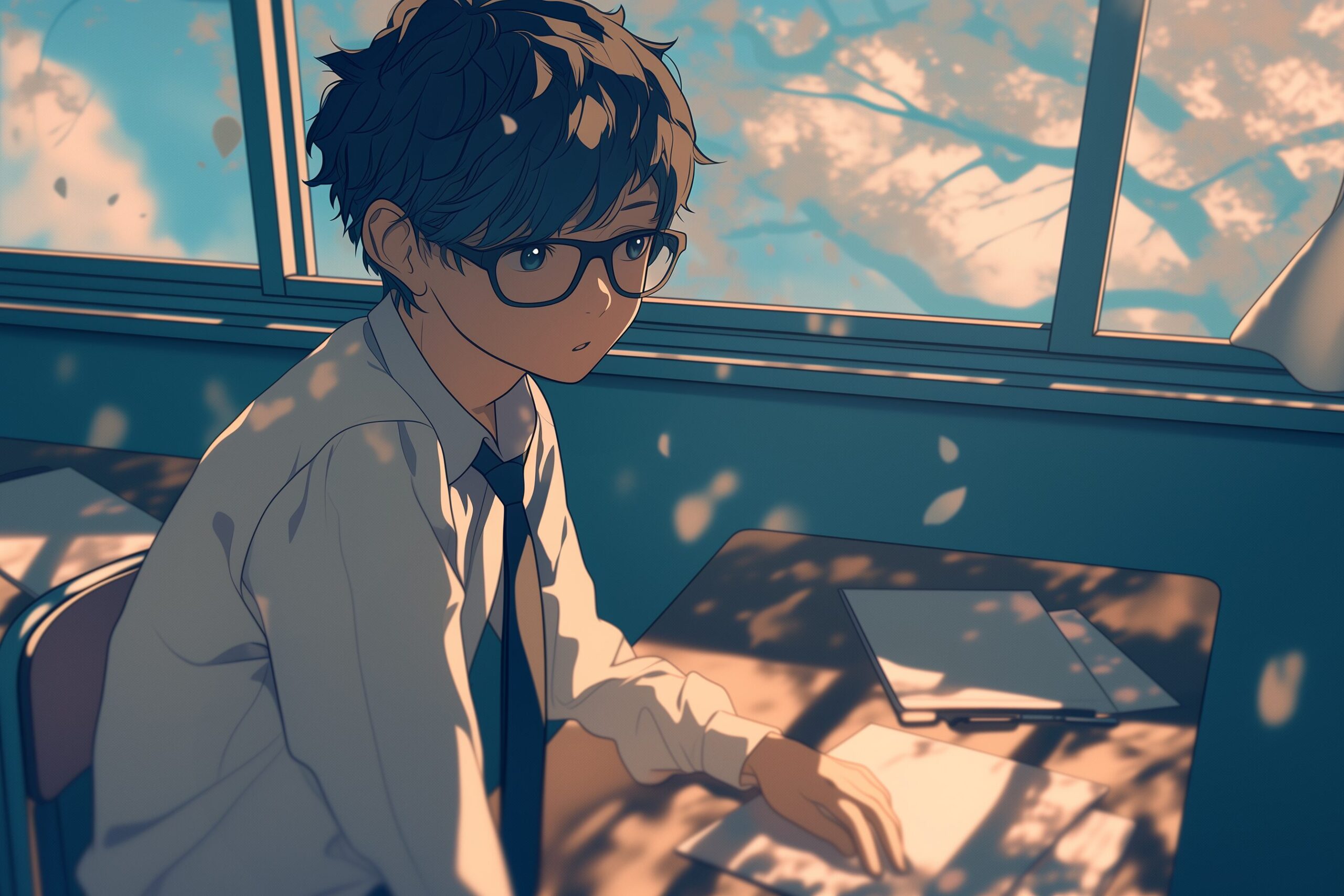 検索タグ:イラスト、キャラクター、男子、男性、男、男の人、アニメ、漫画、マンガ、若い、人物、顔、美しい、綺麗、きれい、キレイ、アート、お洒落、挿絵、インスタ、Instagram、AI生成画像、コピースペース、陰キャ、陰キャラ、めがね、メガネ、眼鏡、学校、教室、勉強、ガリ勉、制服、真面目、マジメ、まじめ