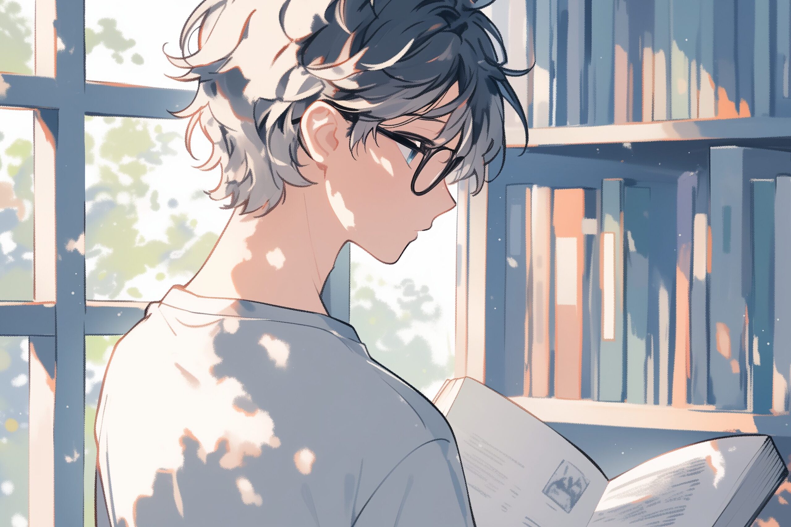 検索タグ:イラスト、キャラクター、男子、男性、男、男の人、アニメ、漫画、マンガ、若い、人物、顔、美しい、綺麗、きれい、キレイ、アート、お洒落、挿絵、インスタ、Instagram、AI生成画像、コピースペース、イケメン、男前、爽やか、さわやか、白シャツ、学校、学生、高校生、微笑み、微笑む、笑顔、かっこいい、カッコいい、カッコイイ、図書館、図書室、眼鏡、メガネ、めがね、黒髪