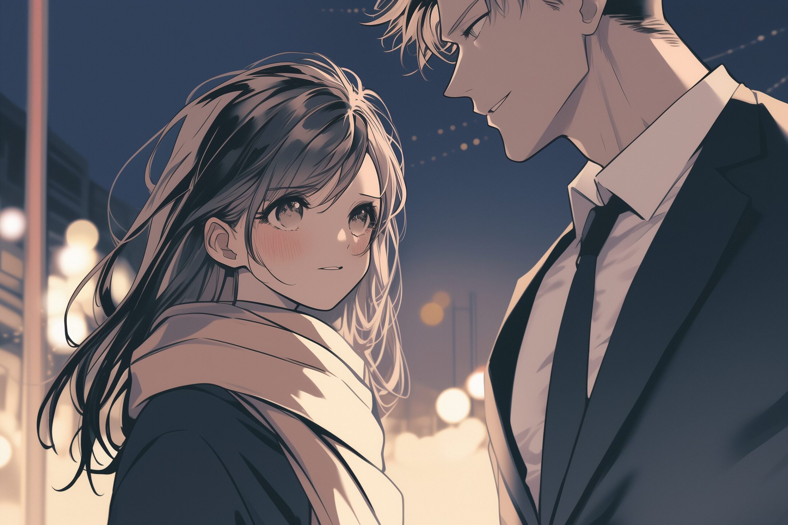 検索タグ:イラスト、ファッション、キャラクター、女性、女、女の子、女子、女の人、アニメ、漫画、マンガ、美人、美女、若い、かわいい、可愛い、カワイイ、人物、顔、美しい、綺麗、きれい、キレイ、アート、お洒落、挿絵、インスタ、Instagram、AI生成画像、コピースペース、カップル、恋人、愛、恋、恋愛、黒髪、笑顔、仲良し、男、男性、スーツ、仕事終わり、ビジネスマン、ビジネスウーマン