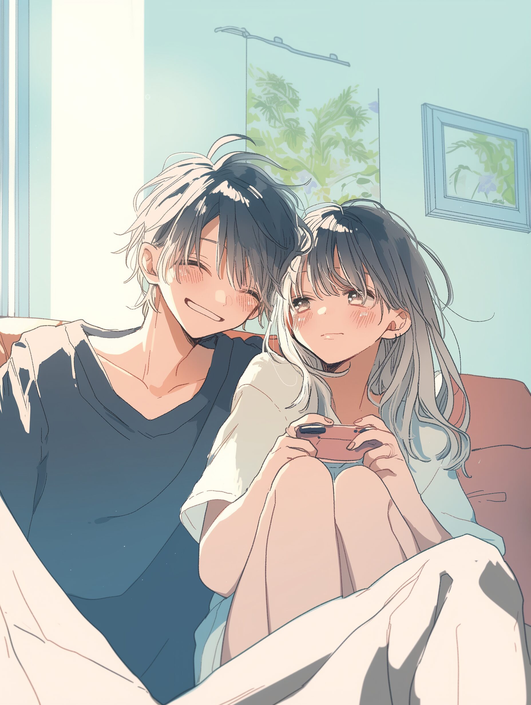 検索タグ:イラスト、ファッション、キャラクター、女性、女、女の子、女子、女の人、アニメ、漫画、マンガ、美人、美女、若い、かわいい、可愛い、カワイイ、人物、顔、美しい、綺麗、きれい、キレイ、アート、お洒落、挿絵、インスタ、Instagram、AI生成画像、fashion、コピースペース、カップル、恋人、愛、恋、恋愛、仲良し、寄り添う、座る、ソファ、室内、部屋、笑顔、笑う、微笑み、微笑む