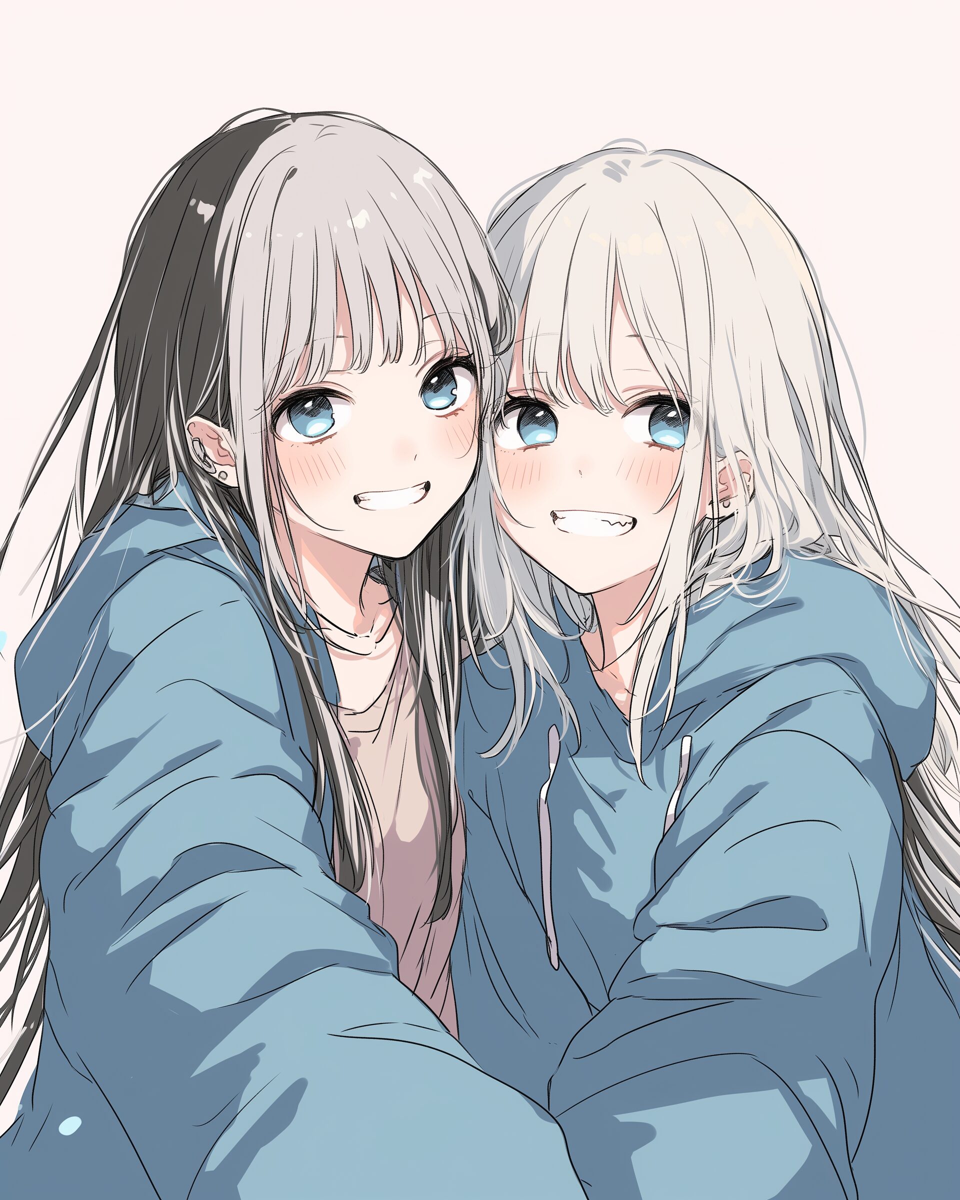 検索タグ:イラスト、ファッション、キャラクター、女性、女、女の子、女子、女の人、アニメ、漫画、マンガ、美人、美女、若い、かわいい、可愛い、カワイイ、人物、顔、美しい、綺麗、きれい、キレイ、アート、お洒落、挿絵、インスタ、Instagram、AI生成画像、fashion、コピースペース、銀髪、笑顔、2人、仲良し、ペアルック、リンクコーデ、パーカー女子