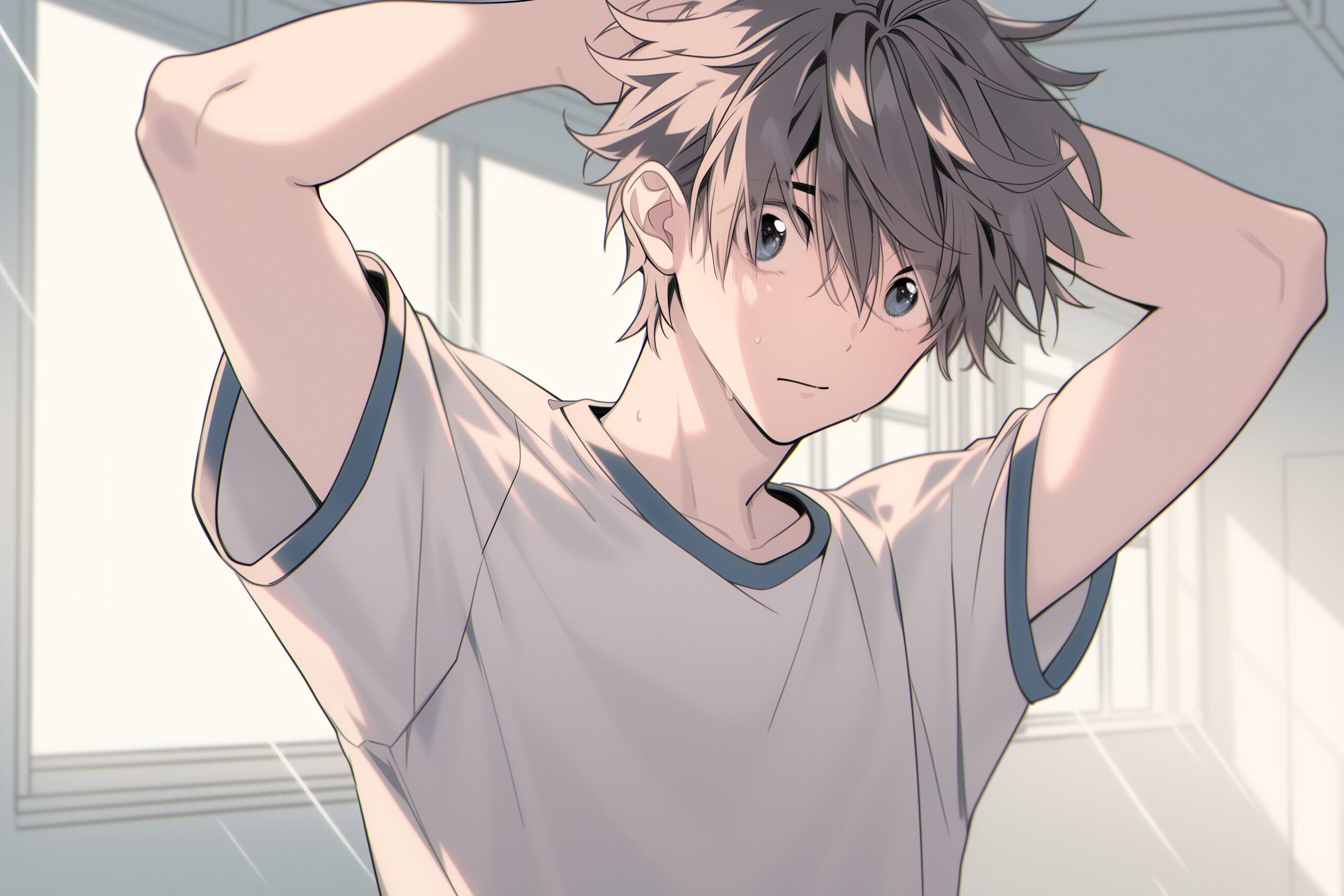検索タグ:イラスト、ファッション、キャラクター、男性、男、男子、男の子、イケメン、男の人、アニメ、漫画、マンガ、若い、人物、顔、アート、挿絵、インスタ、Instagram、AI生成画像、fashion、コピースペース、黒髪、ショートヘア、体操着、体操服、学生、高校生、中学生