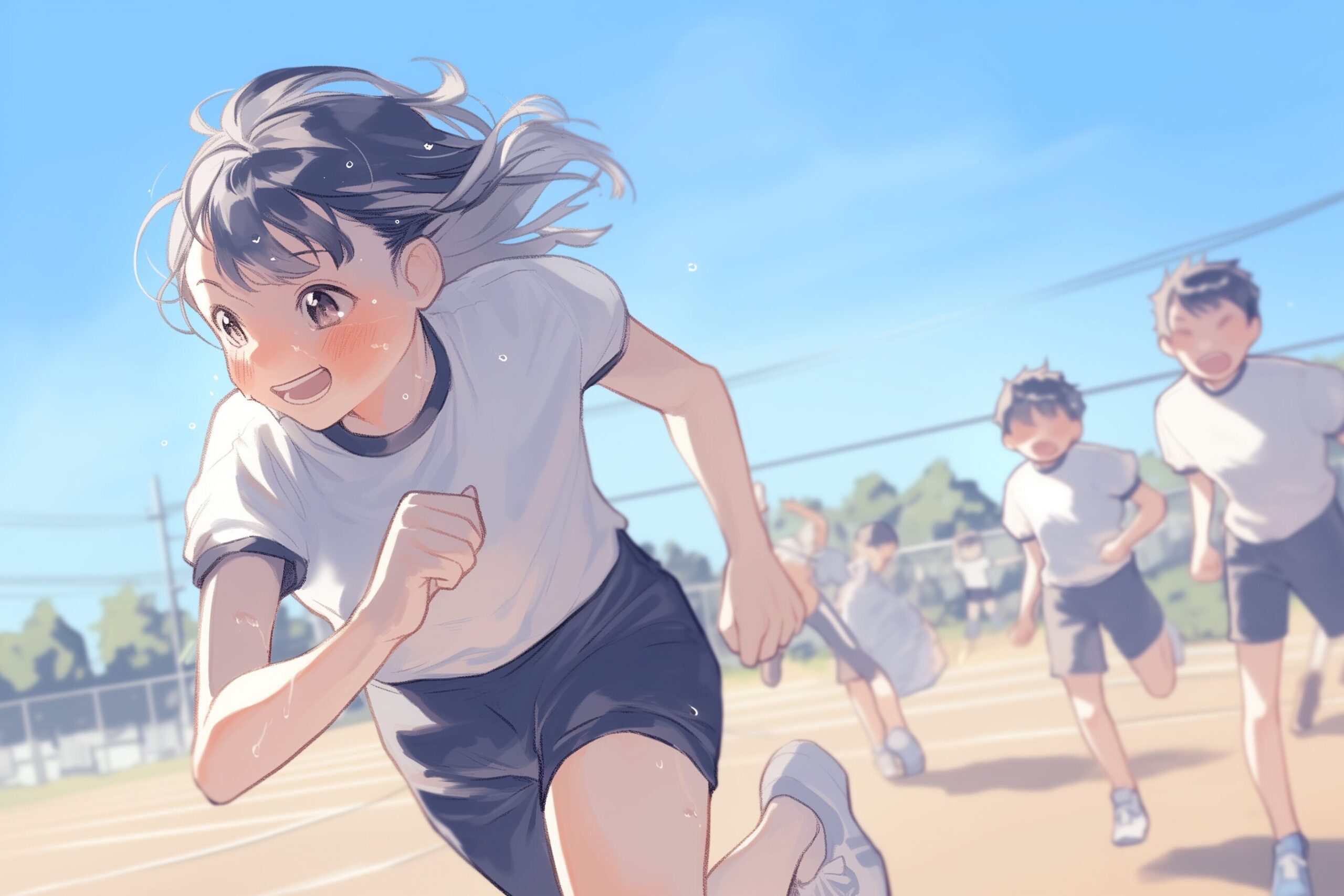 検索タグ:イラスト、アニメ、漫画、マンガ、人物、顔、挿絵、インスタ、Instagram、AI生成画像、コピースペース、女性、女、女の子、小学生、中学生、高校生、女子、体育、体育祭、運動会、リレー、走る、ランニング、マラソン、かけっこ、体操服、体操着、学生、子供