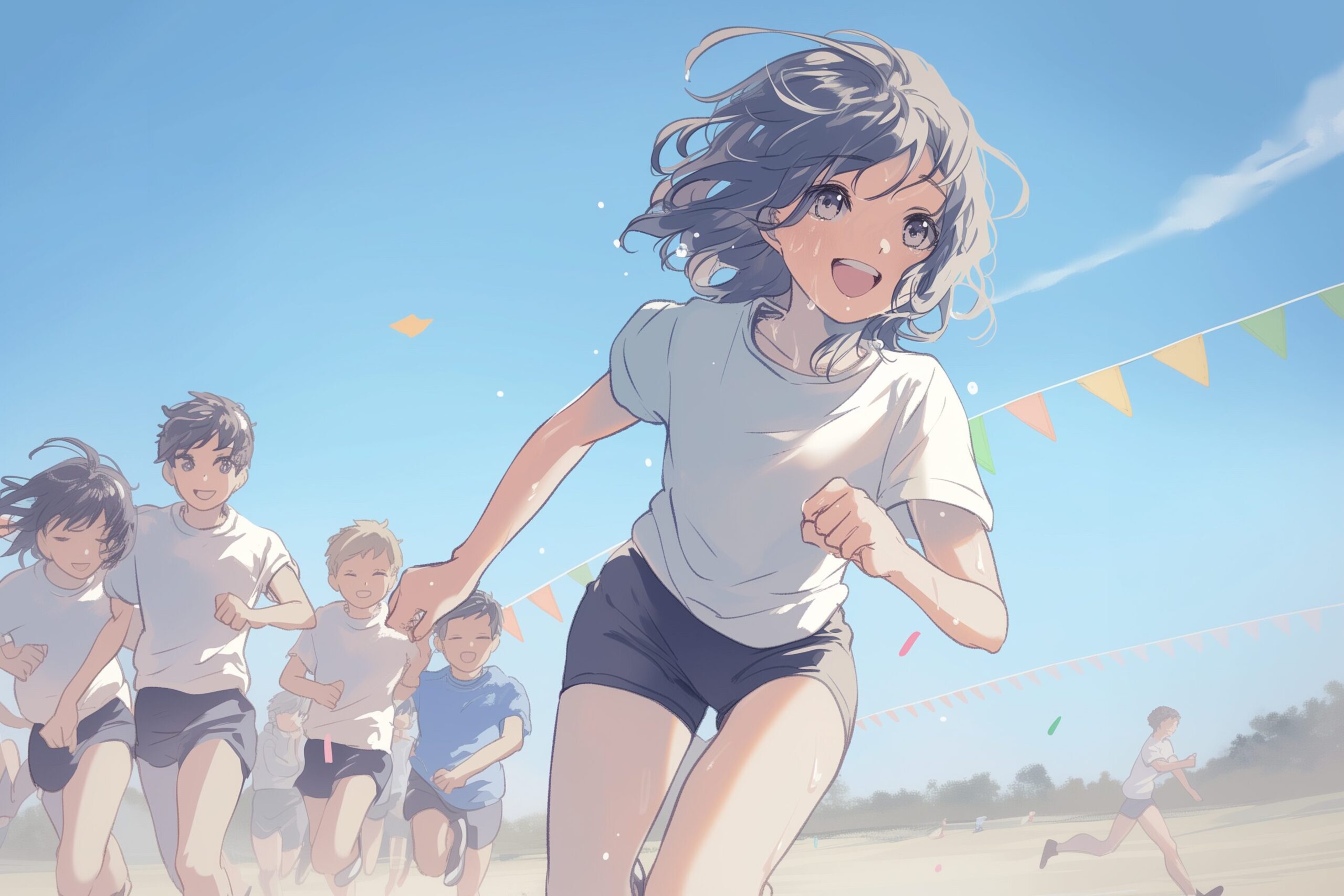 検索タグ:イラスト、アニメ、漫画、マンガ、人物、顔、挿絵、インスタ、Instagram、AI生成画像、コピースペース、女性、女、女の子、小学生、中学生、高校生、女子、体育、体育祭、運動会、リレー、走る、ランニング、マラソン、かけっこ、体操服、体操着、学生、子供