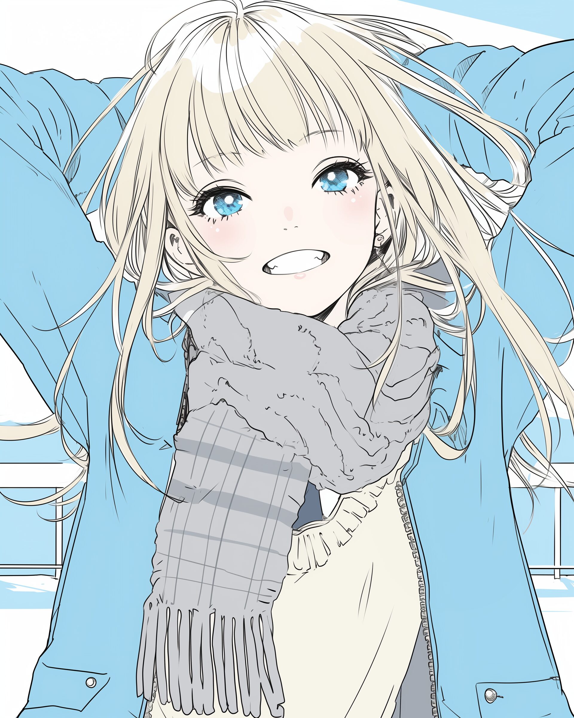 検索タグ:イラスト、ファッション、キャラクター、女性、女、女の子、女子、女の人、アニメ、漫画、マンガ、美人、美女、若い、かわいい、可愛い、カワイイ、人物、顔、美しい、綺麗、きれい、キレイ、アート、お洒落、挿絵、インスタ、Instagram、AI生成画像、fashion、コピースペース、おしゃれ、オシャレ、秋、秋服、冬服、パーカー女子、金髪、ぱっつん、パッツン、冬コーデ、コーディネート、青、ブルー、マフラー、ストール、笑顔