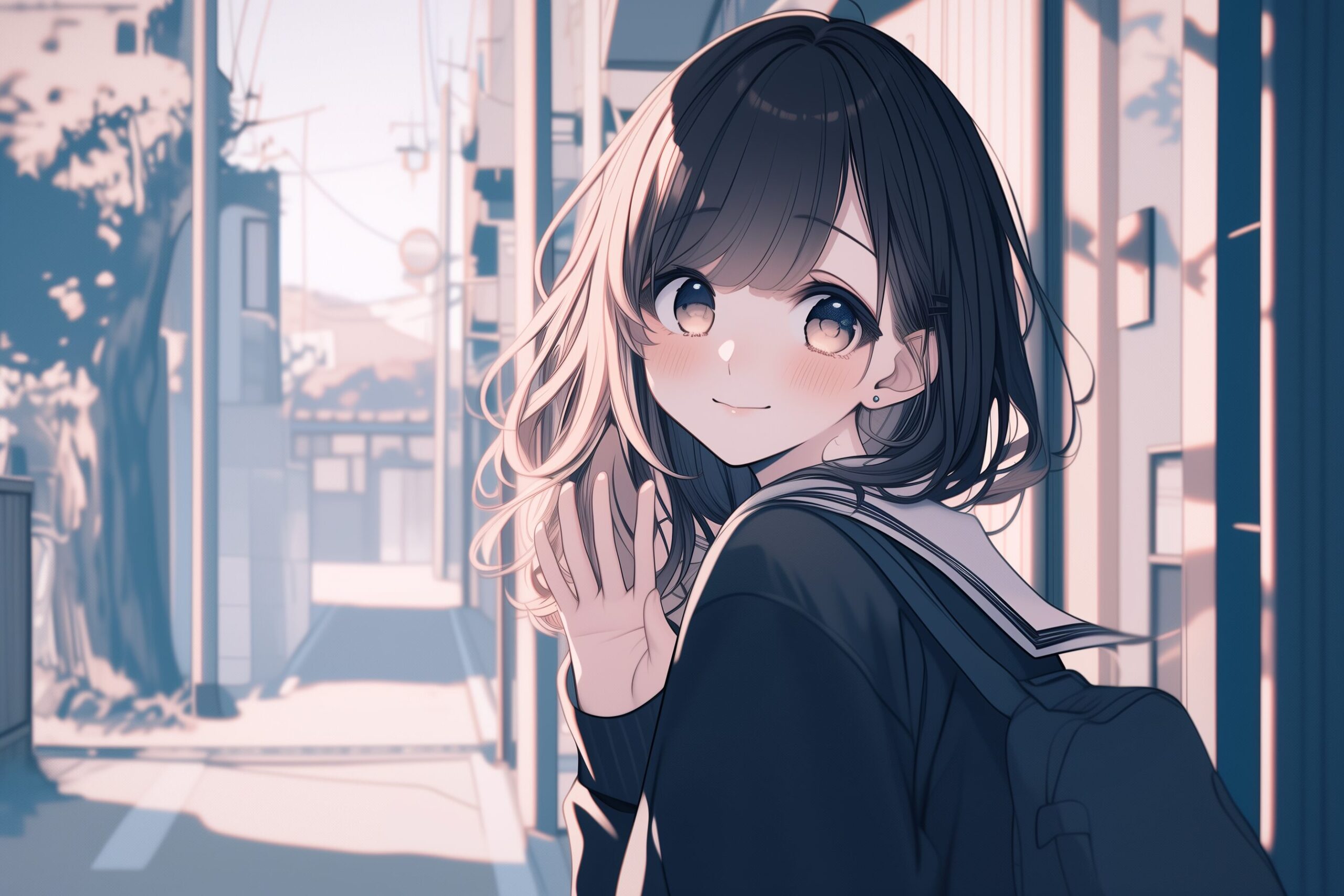 検索タグ:イラスト、キャラクター、女性、女、女の子、女子、女の人、アニメ、漫画、マンガ、美人、美女、若い、かわいい、可愛い、カワイイ、人物、顔、美しい、綺麗、きれい、キレイ、アート、お洒落、挿絵、インスタ、Instagram、AI生成画像、コピースペース、制服、手を振る、振り向く、黒髪、ショートヘア、ボブヘア、笑顔、微笑む、微笑み