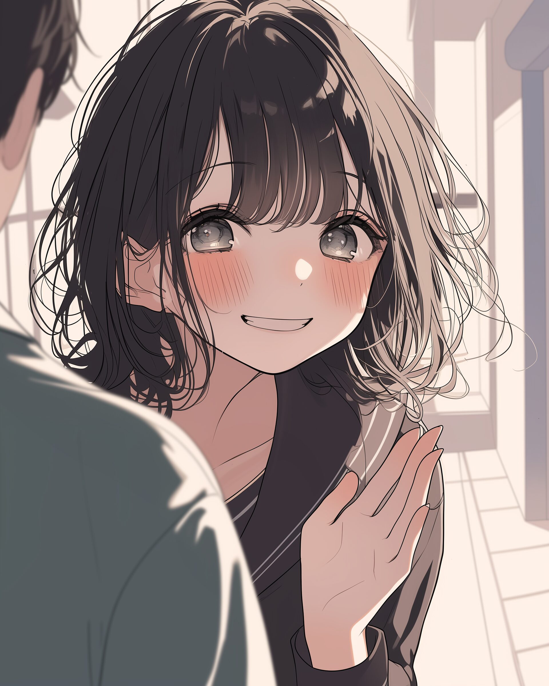 検索タグ:イラスト、キャラクター、女性、女、女の子、女子、女の人、アニメ、漫画、マンガ、美人、美女、若い、かわいい、可愛い、カワイイ、人物、顔、美しい、綺麗、きれい、キレイ、アート、お洒落、挿絵、インスタ、Instagram、AI生成画像、コピースペース、制服、手を振る、振り向く、黒髪、ショートヘア、ボブヘア、笑顔、微笑む、微笑み