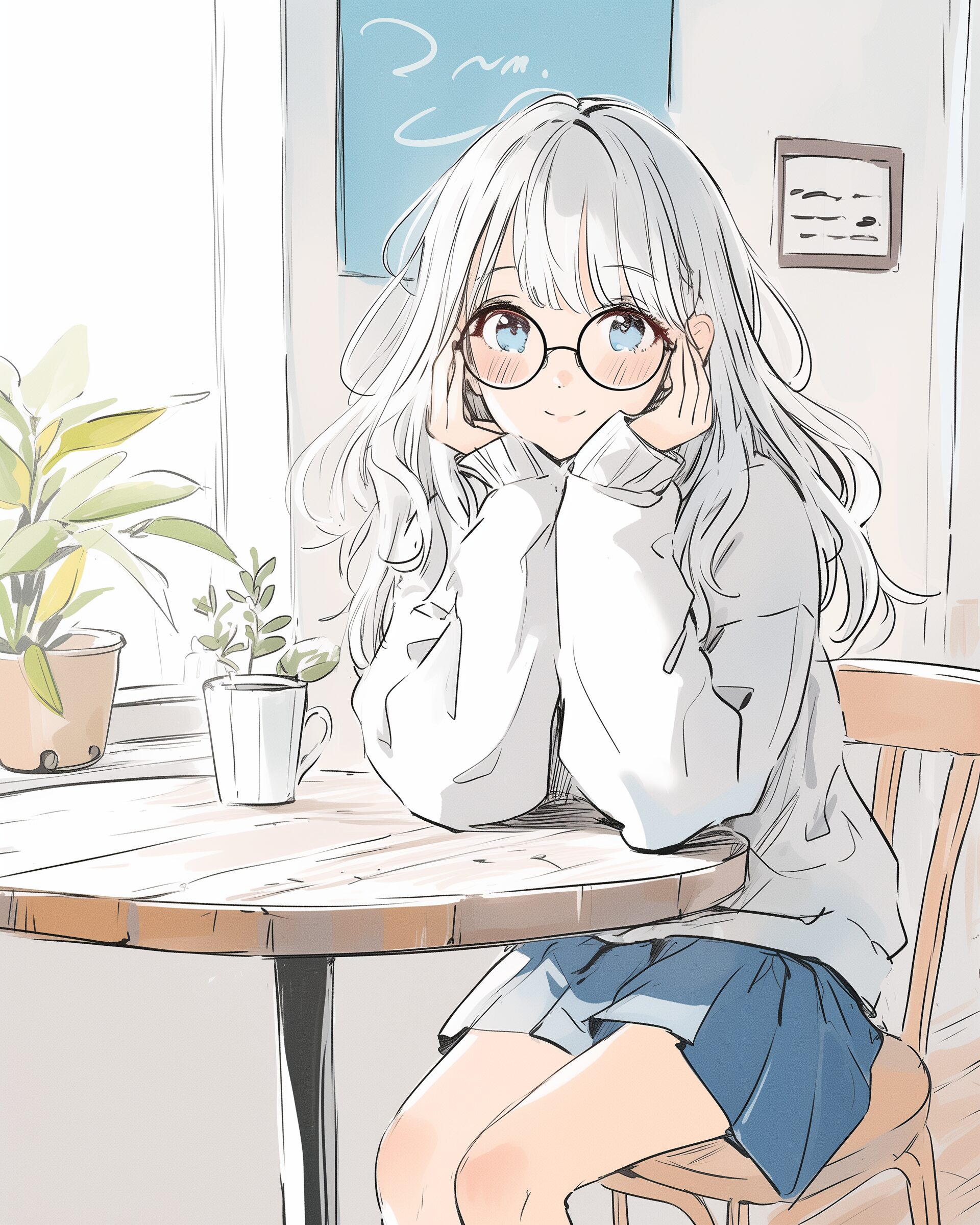 検索タグ:イラスト、ファッション、キャラクター、女性、女、女の子、女子、女の人、アニメ、漫画、マンガ、美人、美女、若い、かわいい、可愛い、カワイイ、人物、顔、美しい、綺麗、きれい、キレイ、アート、お洒落、挿絵、インスタ、Instagram、AI生成画像、fashion、コピースペース、銀髪、勉強、カフェ、座る、眼鏡、メガネ、めがね