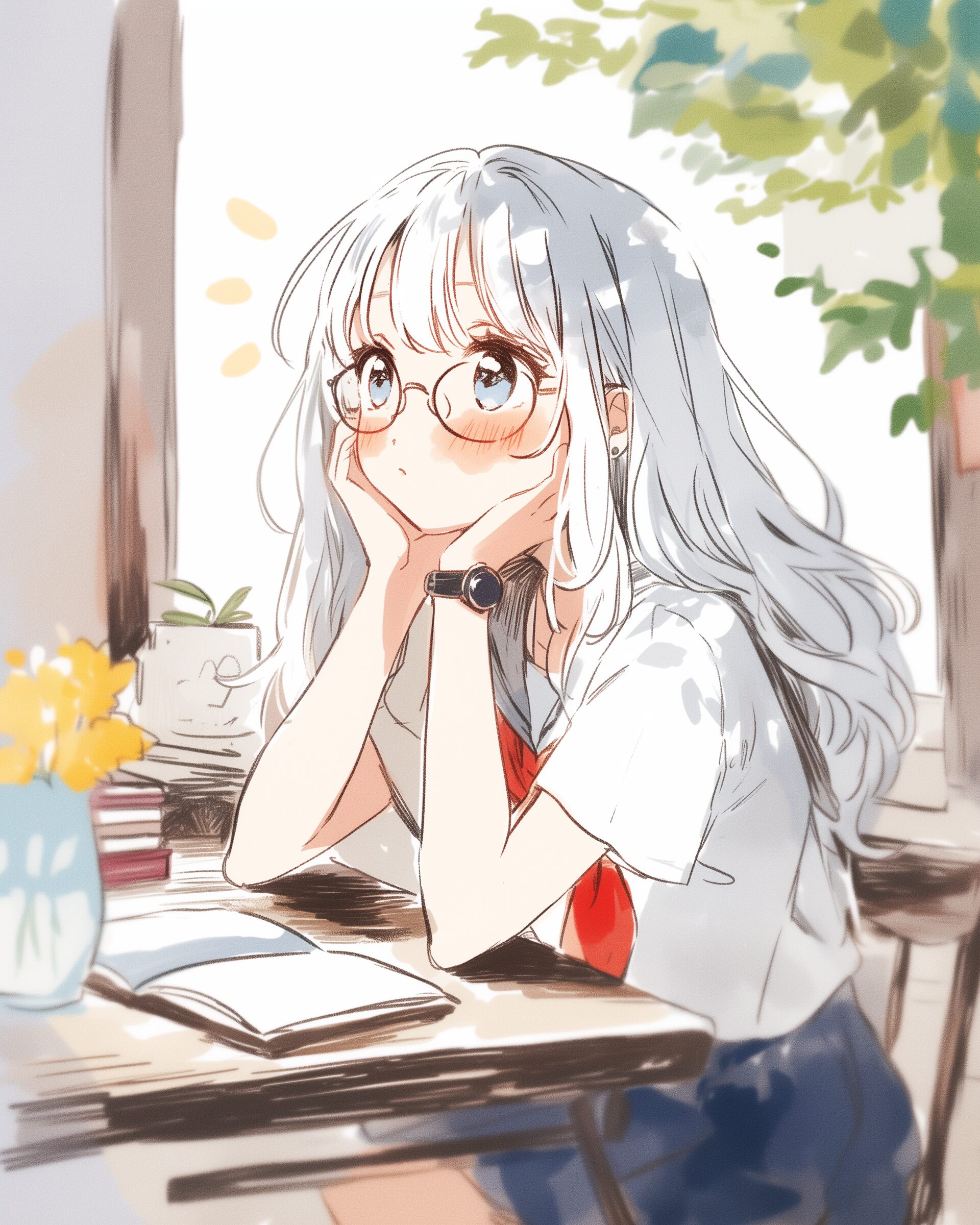検索タグ:イラスト、ファッション、キャラクター、女性、女、女の子、女子、女の人、アニメ、漫画、マンガ、美人、美女、若い、かわいい、可愛い、カワイイ、人物、顔、美しい、綺麗、きれい、キレイ、アート、お洒落、挿絵、インスタ、Instagram、AI生成画像、fashion、コピースペース、銀髪、勉強、カフェ、座る、眼鏡、メガネ、めがね