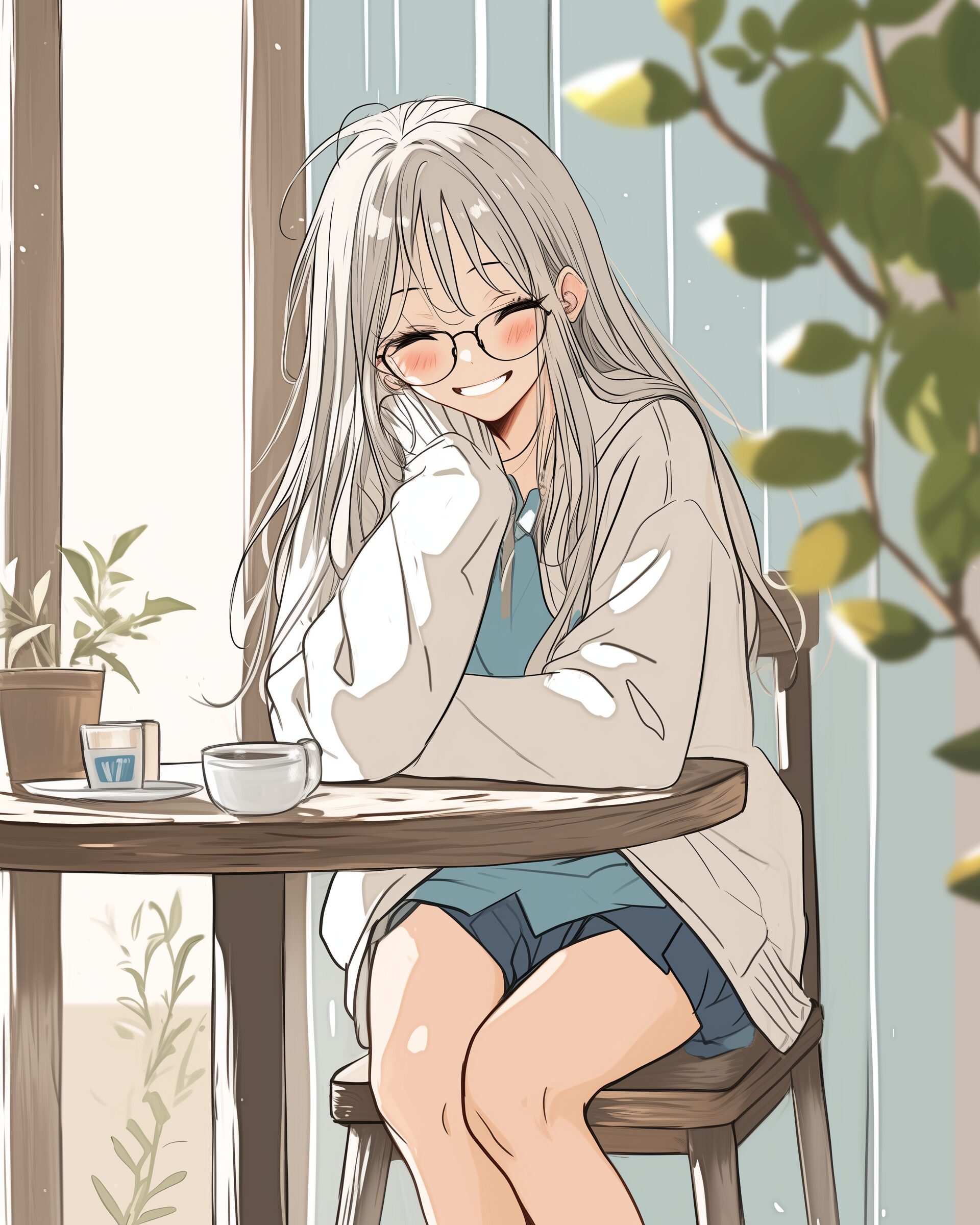 検索タグ:イラスト、ファッション、キャラクター、女性、女、女の子、女子、女の人、アニメ、漫画、マンガ、美人、美女、若い、かわいい、可愛い、カワイイ、人物、顔、美しい、綺麗、きれい、キレイ、アート、お洒落、挿絵、インスタ、Instagram、AI生成画像、fashion、コピースペース、銀髪、勉強、カフェ、座る、眼鏡、メガネ、めがね、笑顔