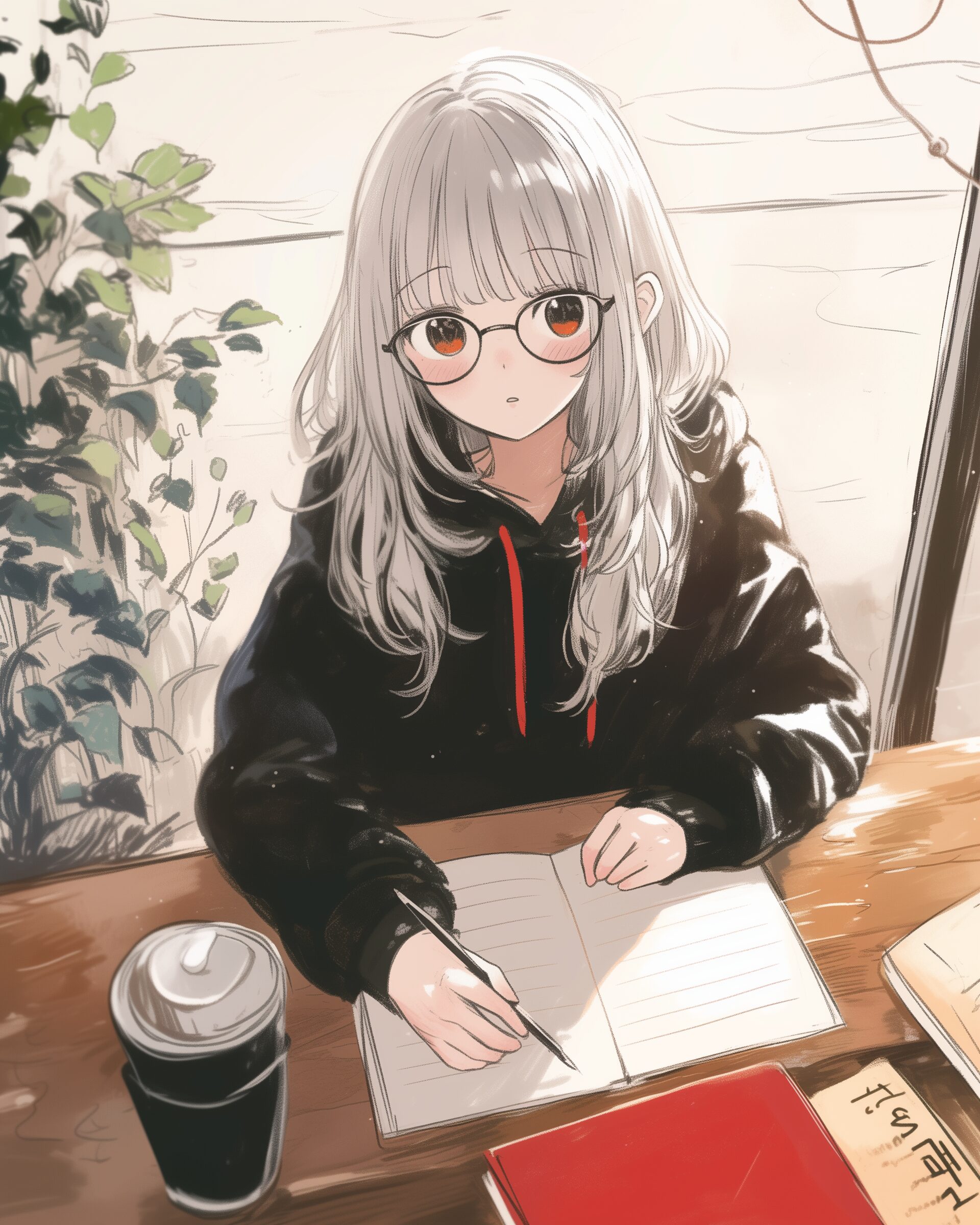 検索タグ:イラスト、ファッション、キャラクター、女性、女、女の子、女子、女の人、アニメ、漫画、マンガ、美人、美女、若い、かわいい、可愛い、カワイイ、人物、顔、美しい、綺麗、きれい、キレイ、アート、お洒落、挿絵、インスタ、Instagram、AI生成画像、fashion、コピースペース、銀髪、勉強、カフェ、座る、眼鏡、メガネ、めがね、笑顔
