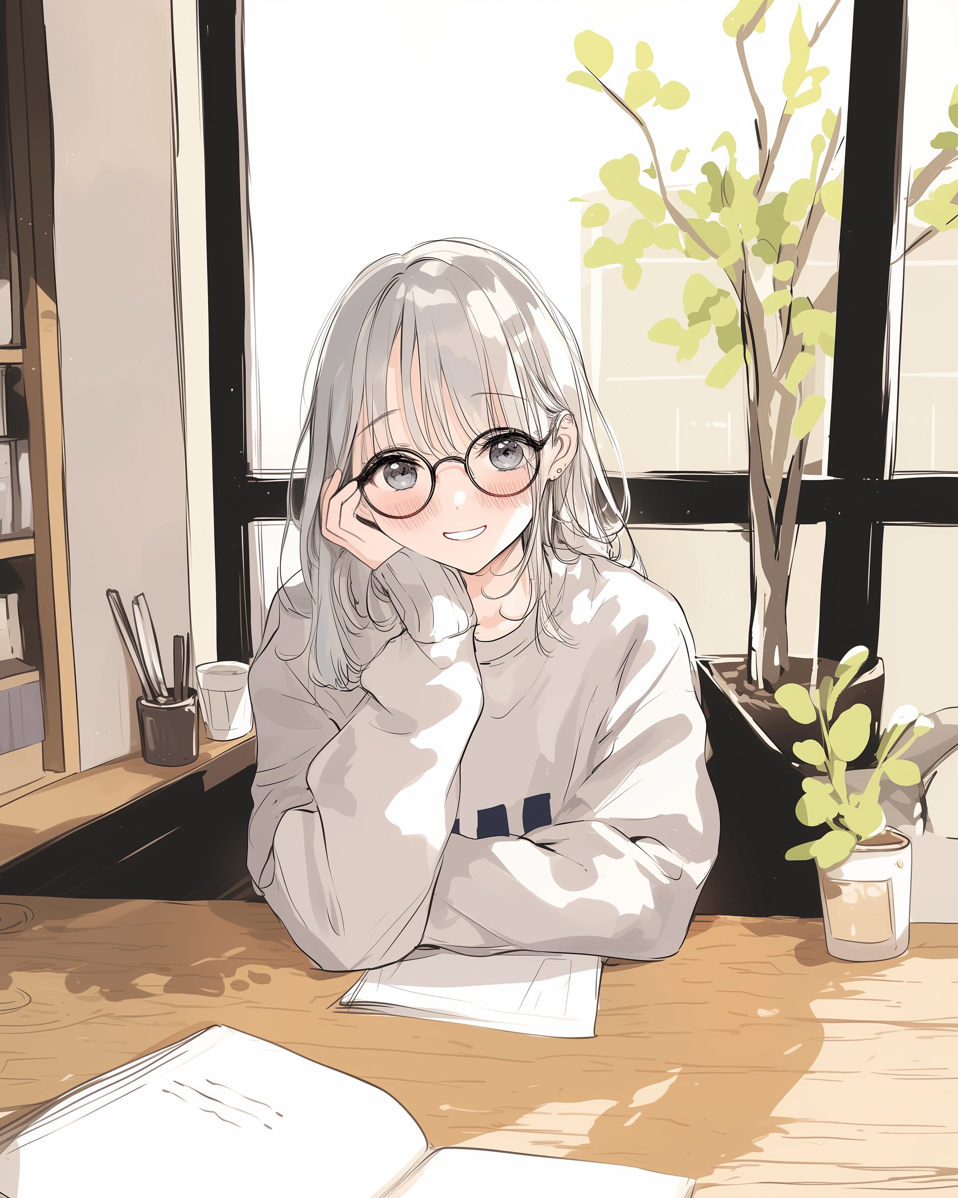 検索タグ:イラスト、ファッション、キャラクター、女性、女、女の子、女子、女の人、アニメ、漫画、マンガ、美人、美女、若い、かわいい、可愛い、カワイイ、人物、顔、美しい、綺麗、きれい、キレイ、アート、お洒落、挿絵、インスタ、Instagram、AI生成画像、fashion、コピースペース、銀髪、勉強、カフェ、座る、眼鏡、メガネ、めがね、笑顔