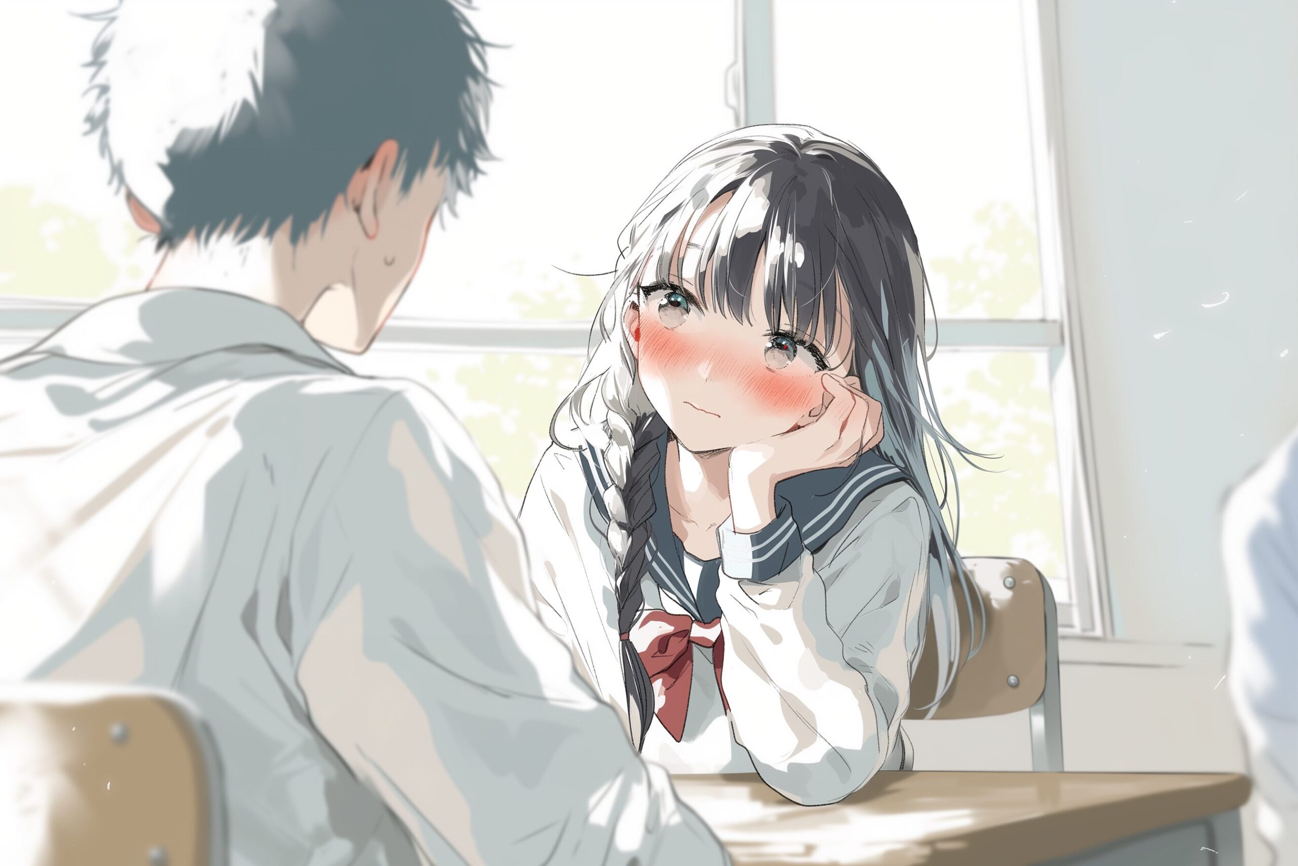 検索タグ:イラスト、キャラクター、女性、女、女の子、女子、女の人、アニメ、漫画、マンガ、美人、美女、若い、かわいい、可愛い、カワイイ、人物、顔、美しい、綺麗、きれい、キレイ、アート、お洒落、挿絵、インスタ、Instagram、AI生成画像、コピースペース、三つ編み、恥ずかしい、照れる、勉強、学校、制服