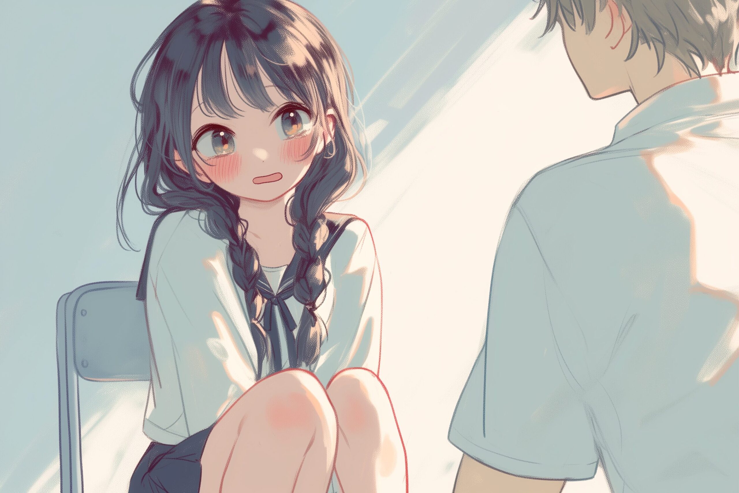 検索タグ:イラスト、キャラクター、女性、女、女の子、女子、女の人、アニメ、漫画、マンガ、美人、美女、若い、かわいい、可愛い、カワイイ、人物、顔、美しい、綺麗、きれい、キレイ、アート、お洒落、挿絵、インスタ、Instagram、AI生成画像、コピースペース、三つ編み、恥ずかしい、照れる、勉強、学校、制服